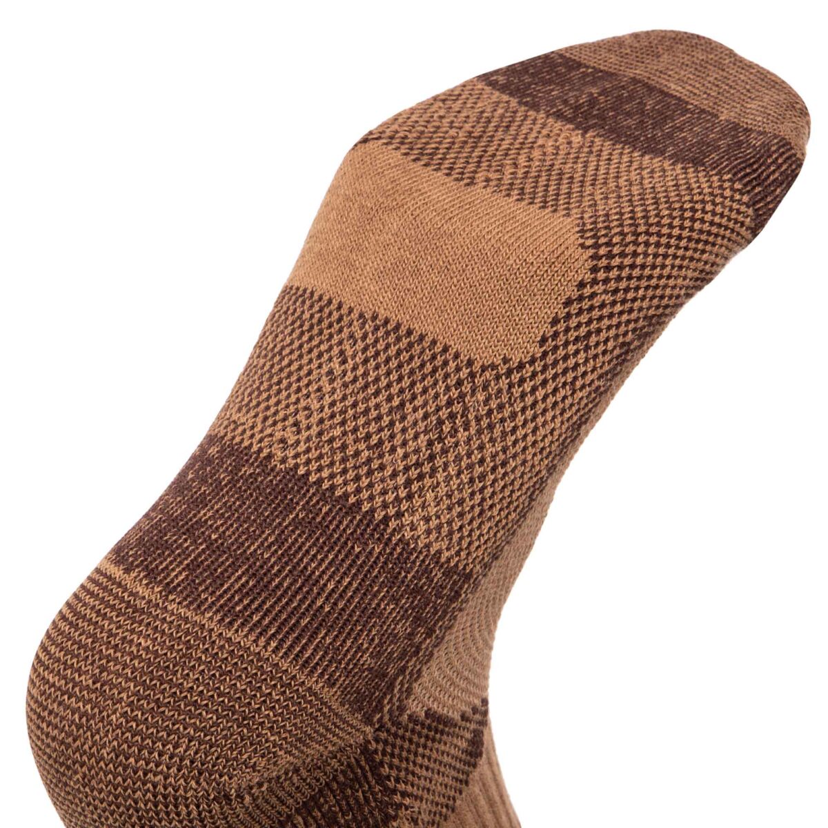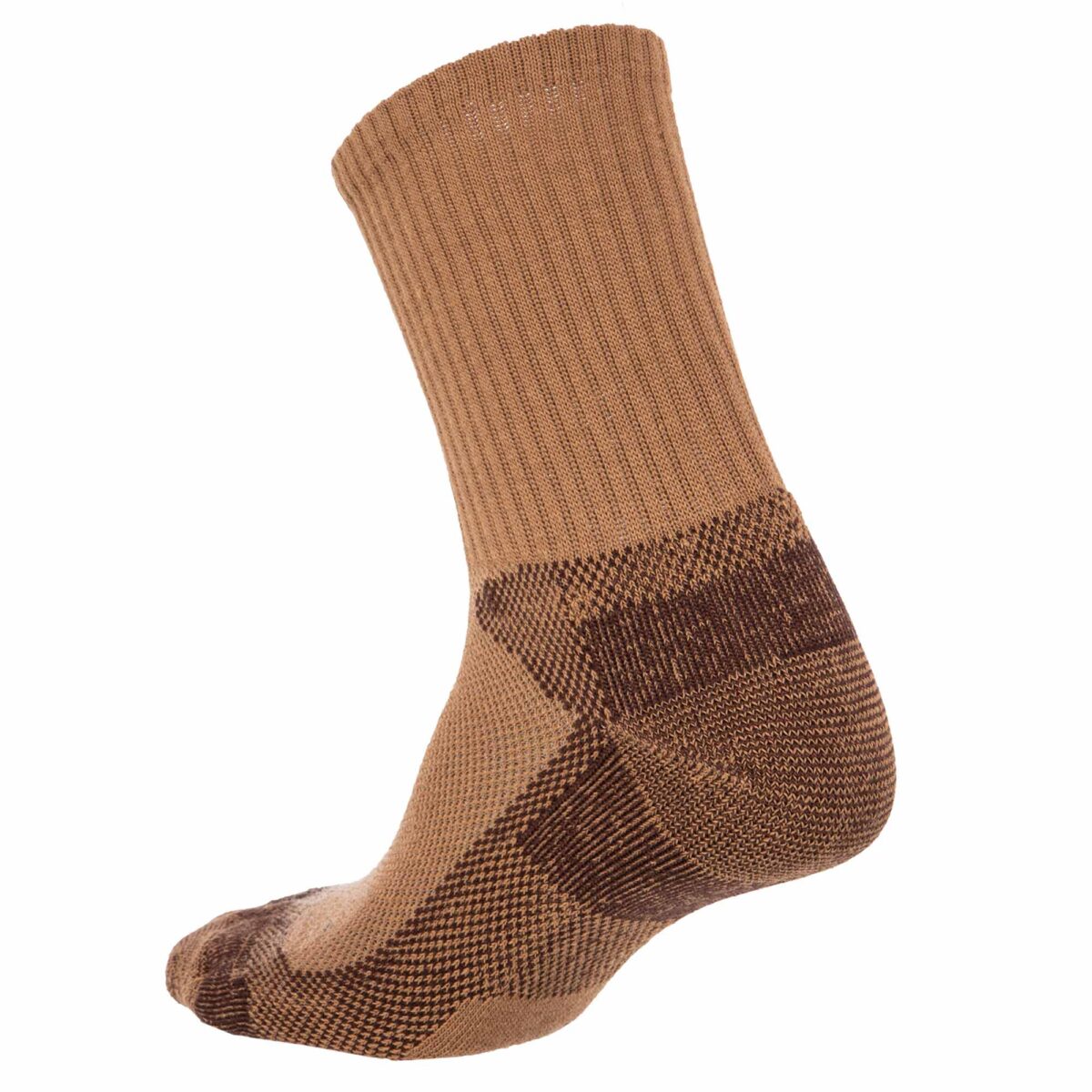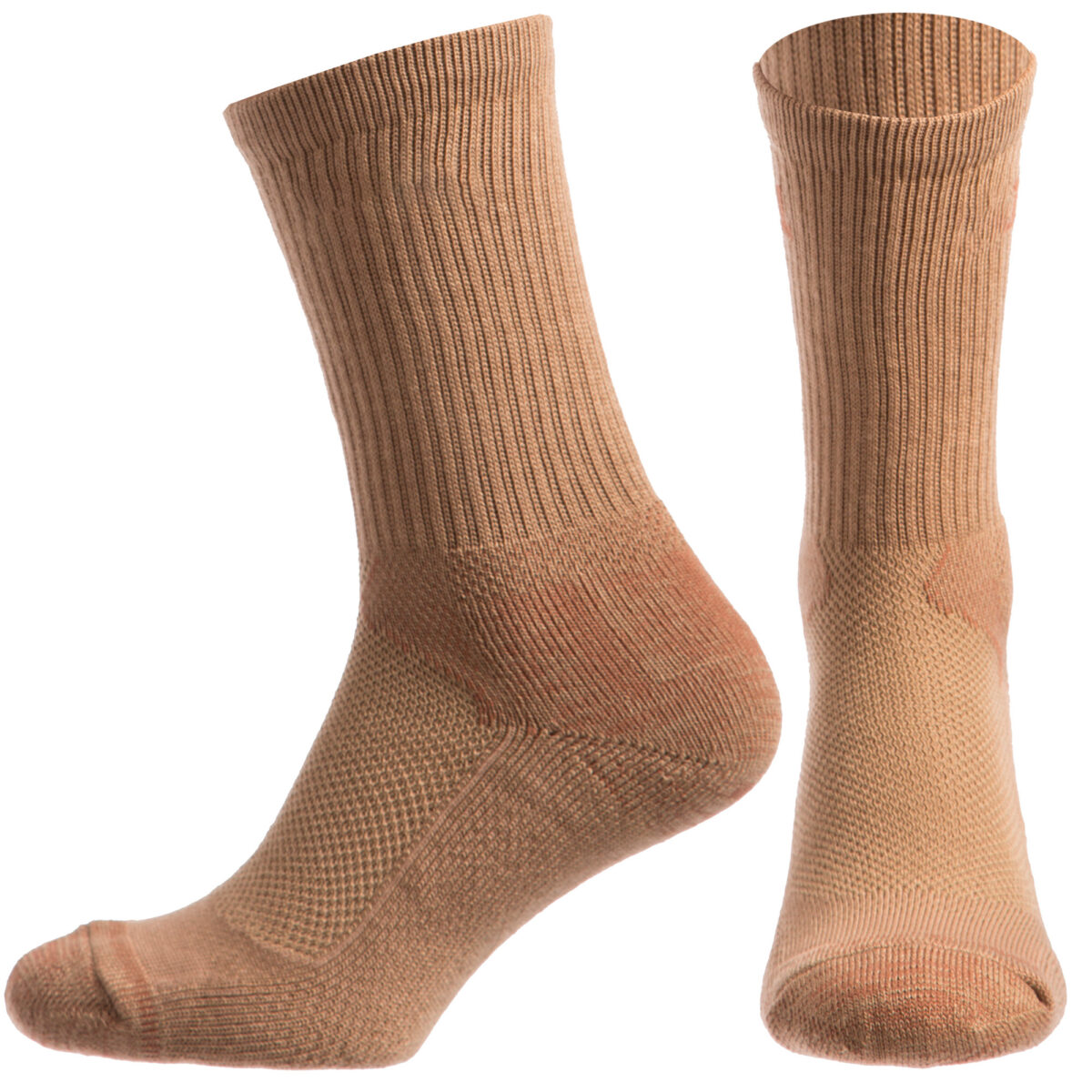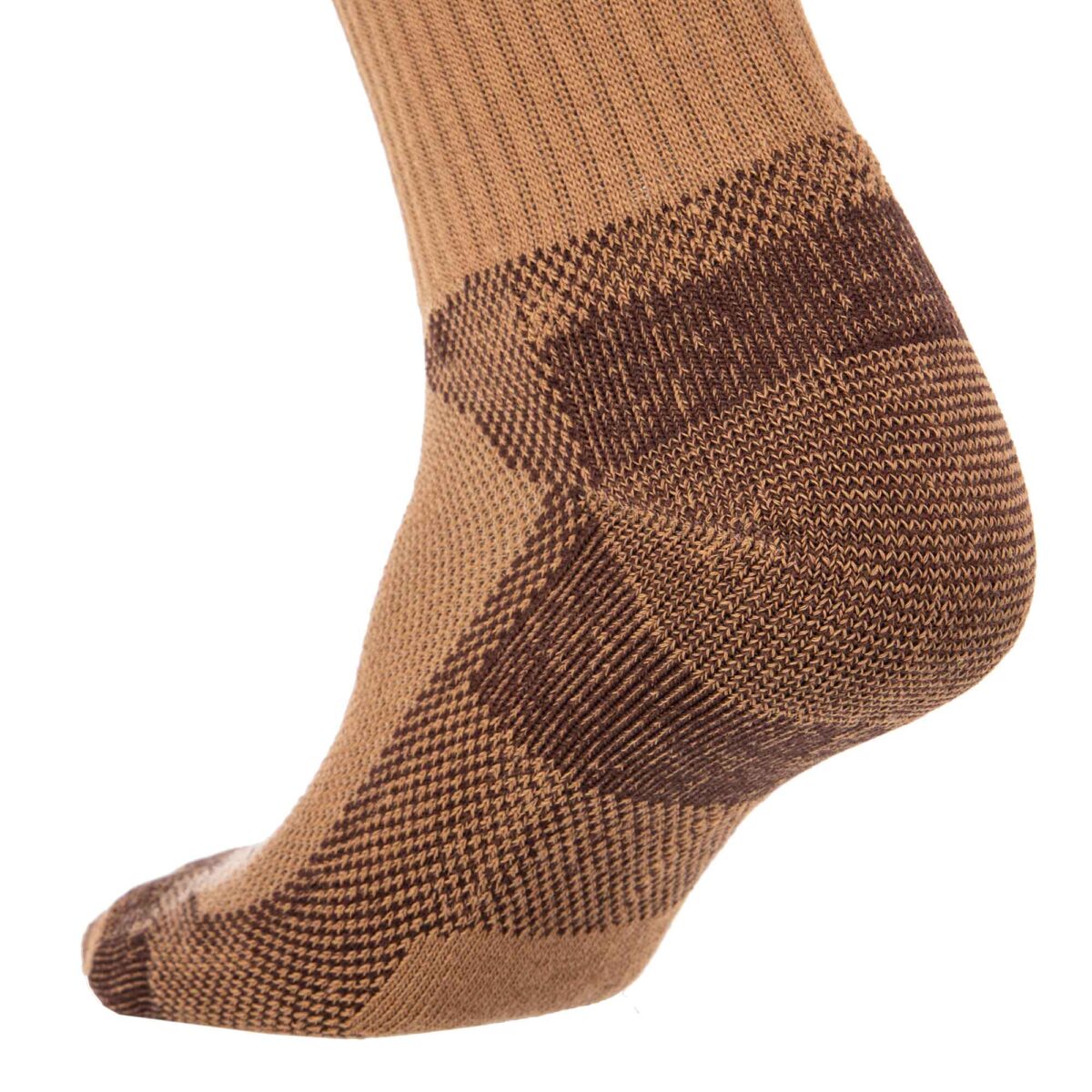 Термоноски Tactical были разработаны как элемент экипировки для длительных переходов в зимнее время (турпоход, охота, альпинизм), однако пользуются широкой популярностью и в повседневной жизни. Для их изготовления используется смесовая нить, которая включает хлопок, волокна нейлона, спандекса и полиэстера. Этот материал отводит влагу с кожи эффективнее, чем чистый хлопок – а, значит, ноги остаются сухими и не подвергаются таким неприятностям как переохлаждение и потёртости. Также он характеризуется эластичностью, за счет чего носки не только надежно держаться на ноге, но и оказывают компрессионное воздействие, снижая усталость. Мысок и пятка носков усилены дополнительной нитью и устойчивы к истиранию.