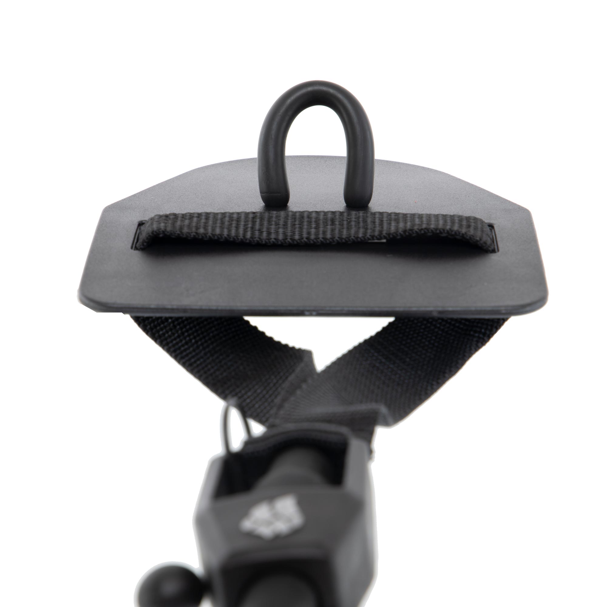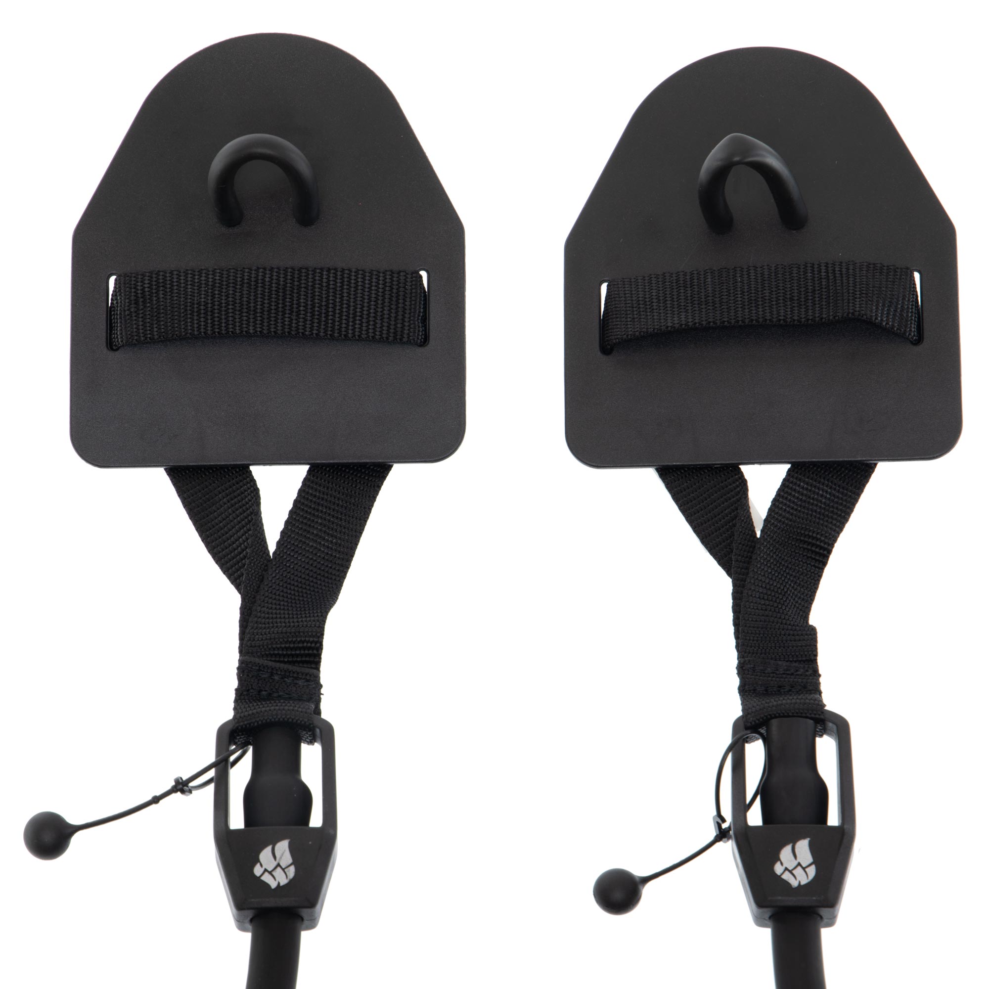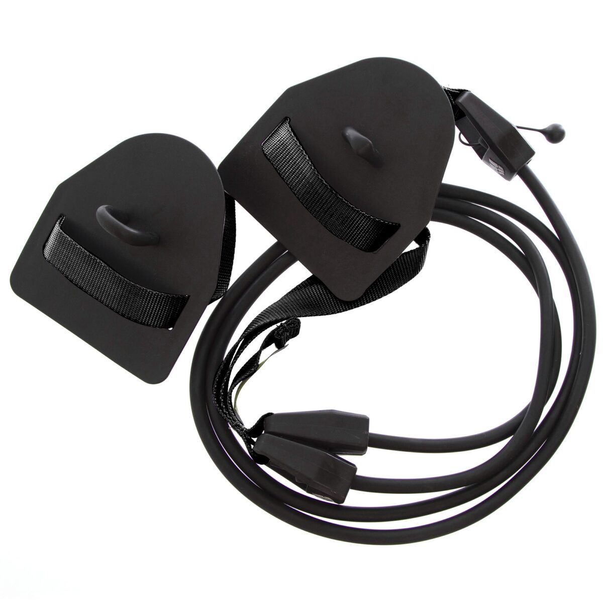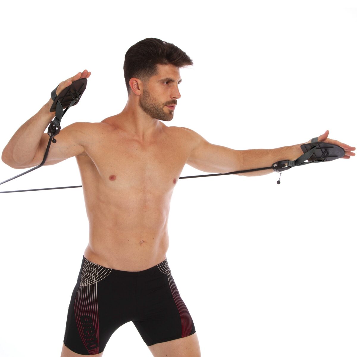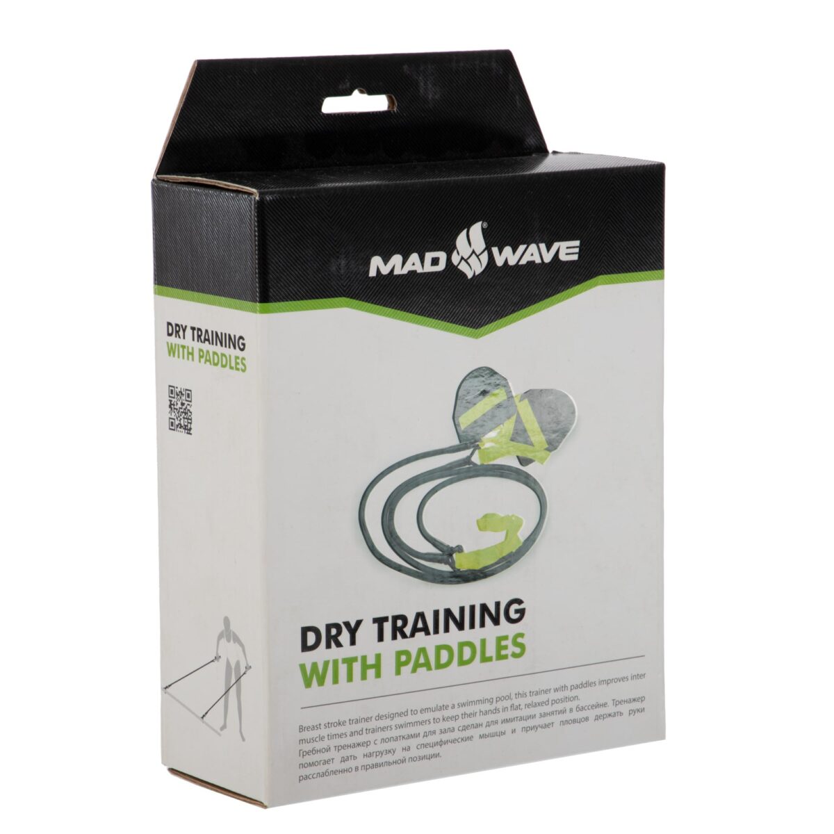 Тренажер DRY TRAINING WITH PADDLES представляет собой два латексных троса, соединенных с нейлоновой петлей, с помощью которой тренажер крепится на любой прочной (желательно металлической) конструкции, на свободных концах тросов расположены лопатки. Лопатки позволяют руке и ладони находиться в таком же положении, как и во время гребка в воде, это значительно повышает эффективность тренировок, максимально приближая занятия с тренажером к плаванию в бассейне. В процессе тренировки пловец имитирует движения, совершаемые в воде, благодаря чему замечает и исправляет ошибки, совершаемые при выполнении гребка.