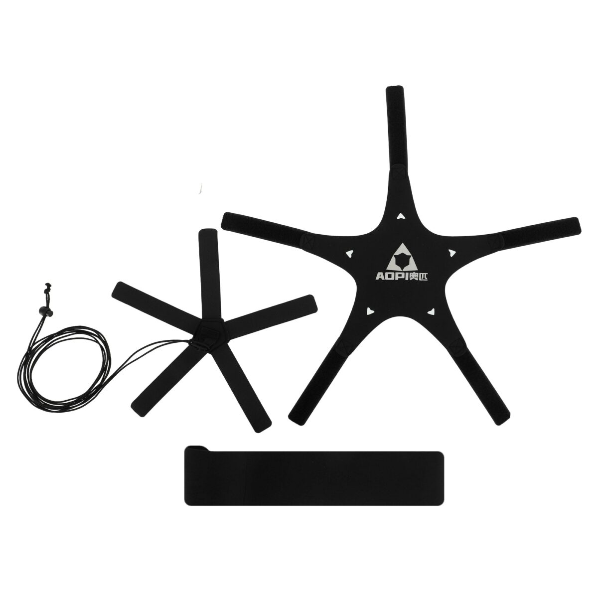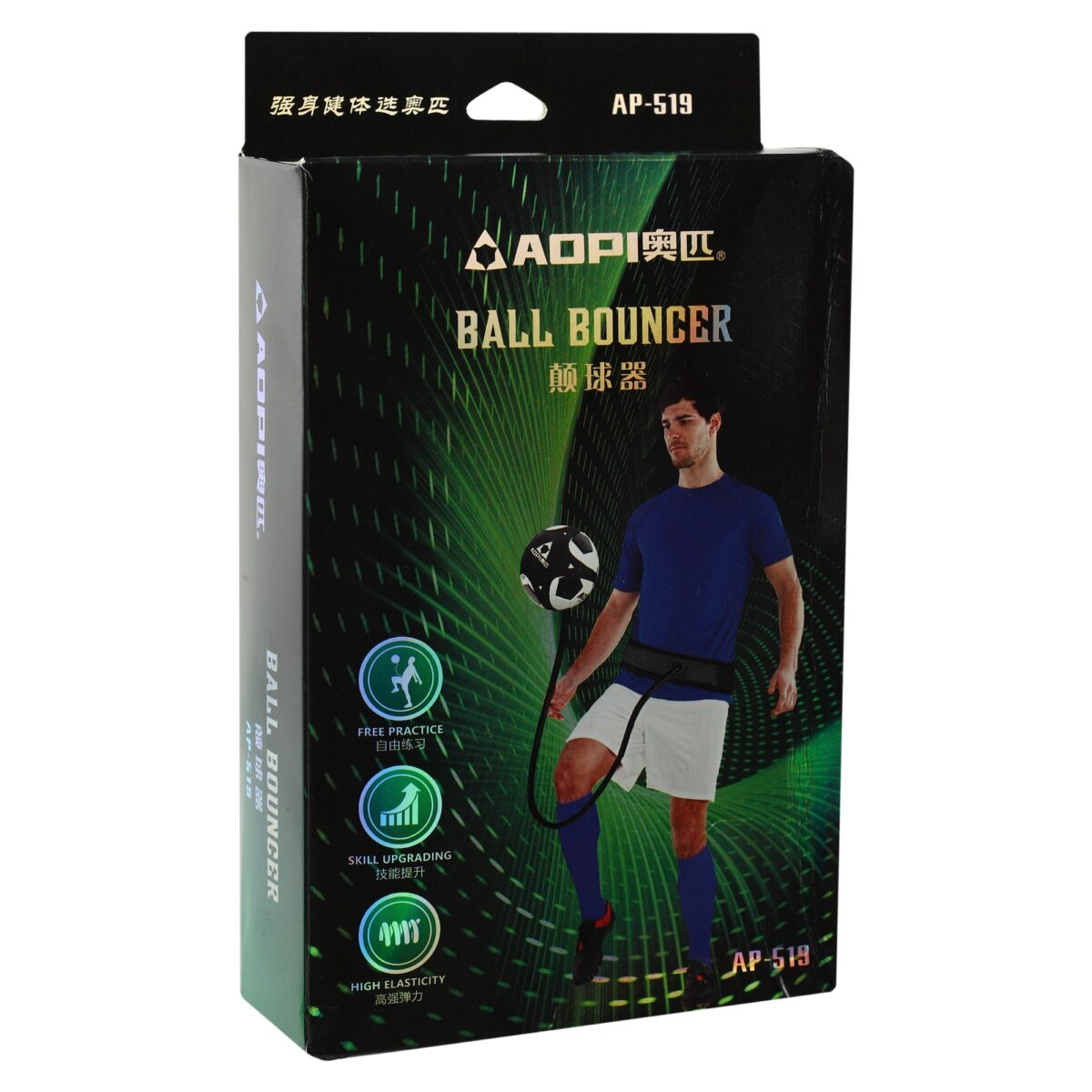 Футбольный тренажер от бренда AOPI состоит из пояса, резинки и специального крепления для мяча. Пояс имеет универсальный размер, его можно отрегулировать по посадке. Для крепления резинки на поясе присутствует карабин. Пояс изготовлен из неопрена.