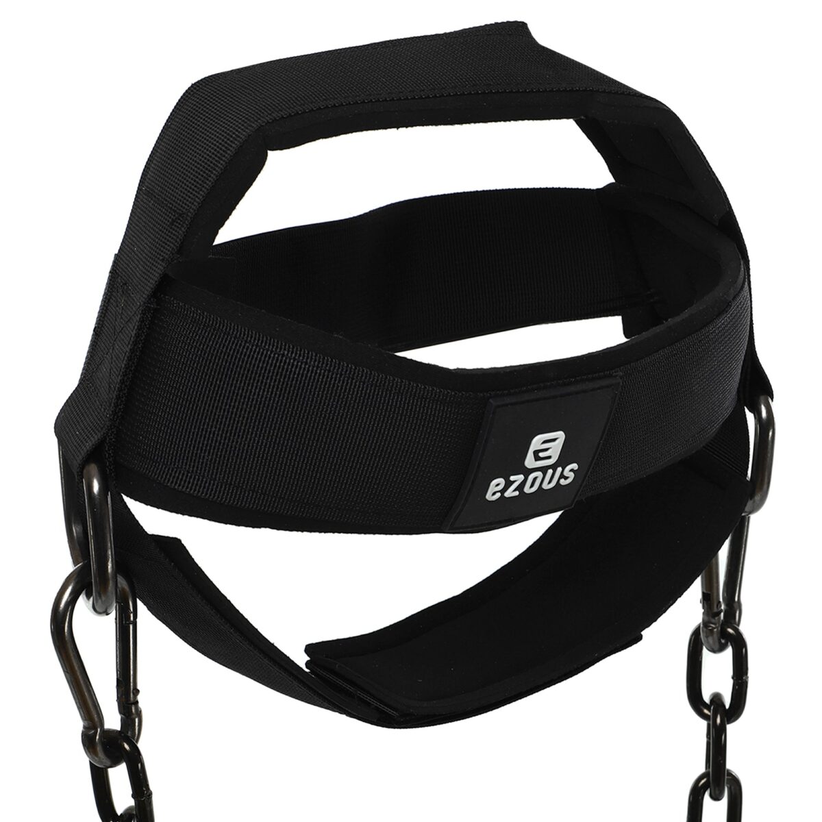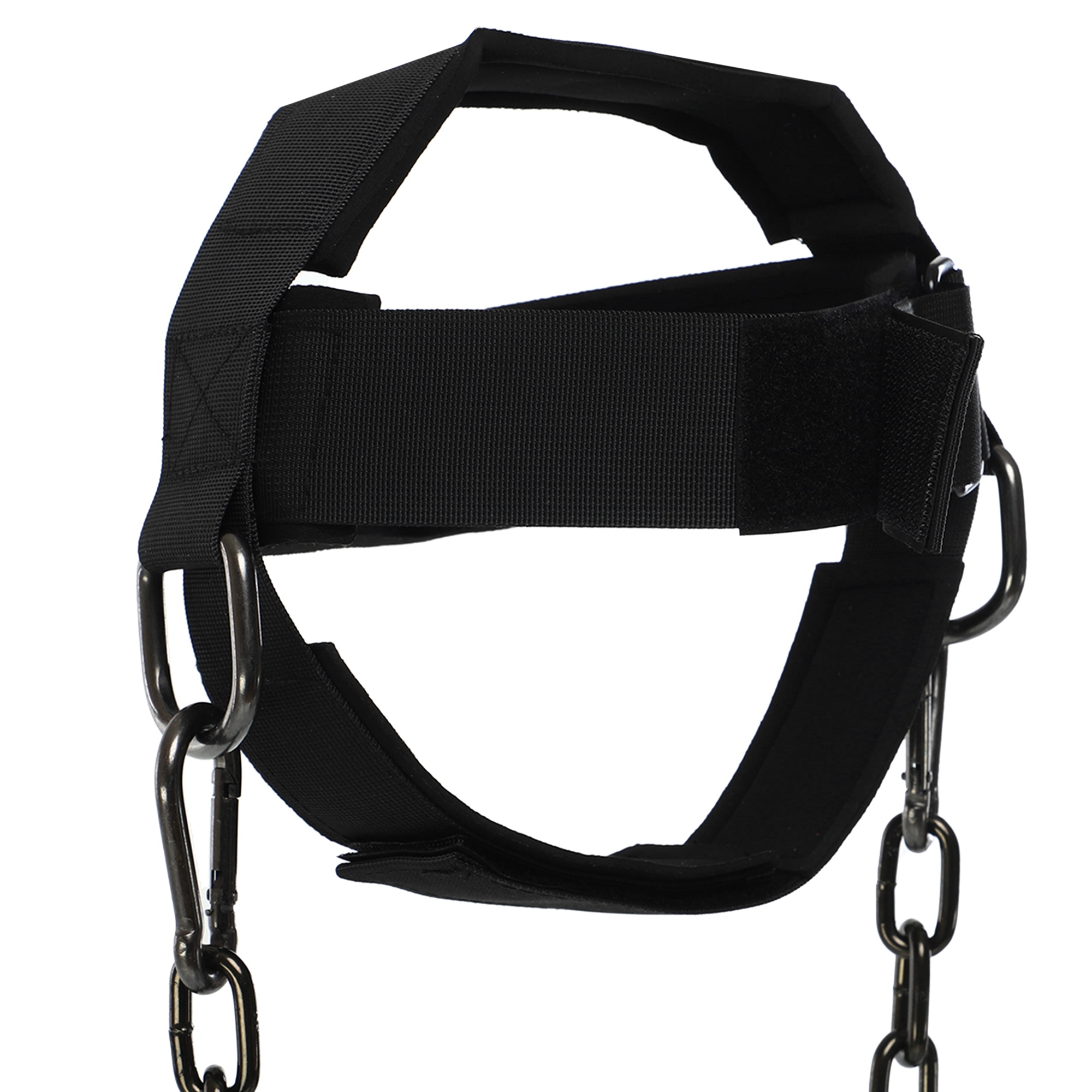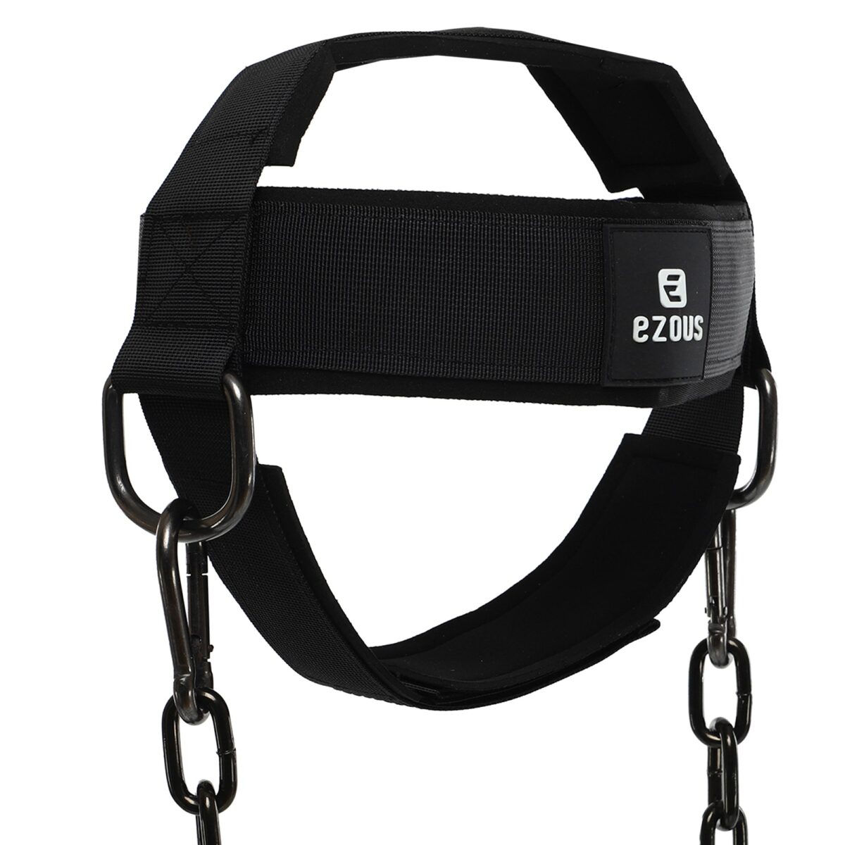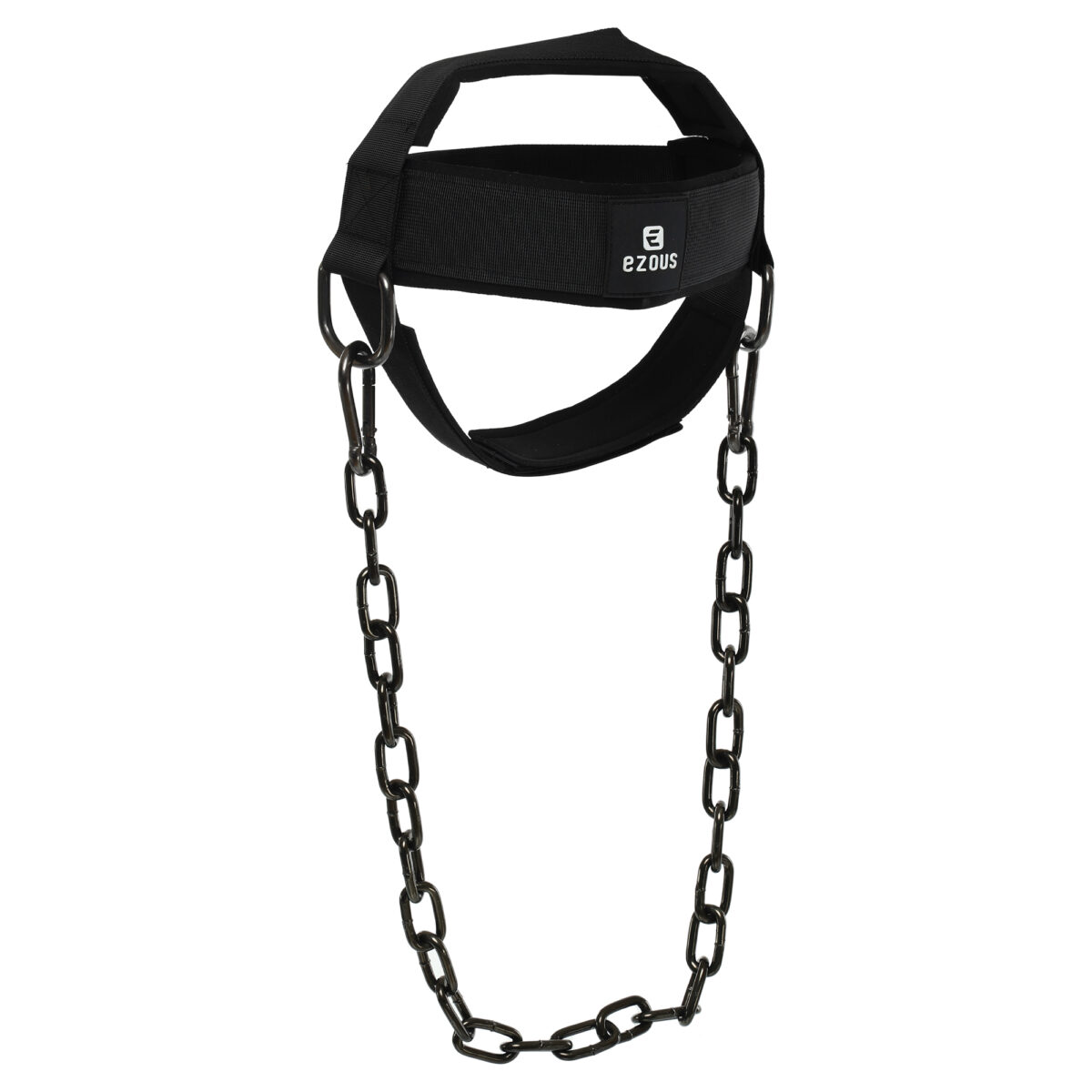NECK HARNESS EZOUS — это удобный аксессуар, который позволяет нагрузить мышцы шеи. Упряжь состоит из специального крепления на голову, которое изготовлено из полиэстера. К креплению на голову с помощью карабина цепляется стальная цепь, на нее можно подвесить дополнительное отягощение. В качестве отягощения при выполнении упражнений с упряжью можно использовать диски от штанги или гантели. Вес отягощения необходимо постепенно увеличивать, чтобы не травмировать мышцы шеи. Удобное крепление на голову регулируется по посадке и фиксируется с помощью липучки. Карабины есть на обоих концах цепи.