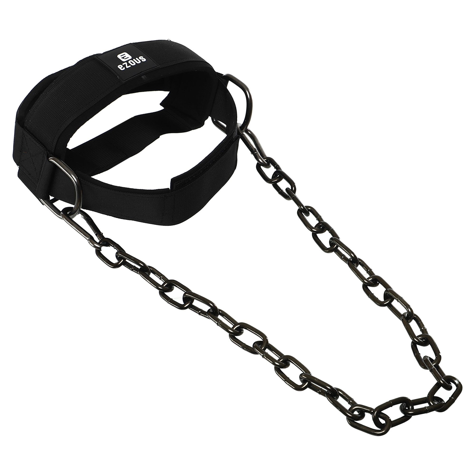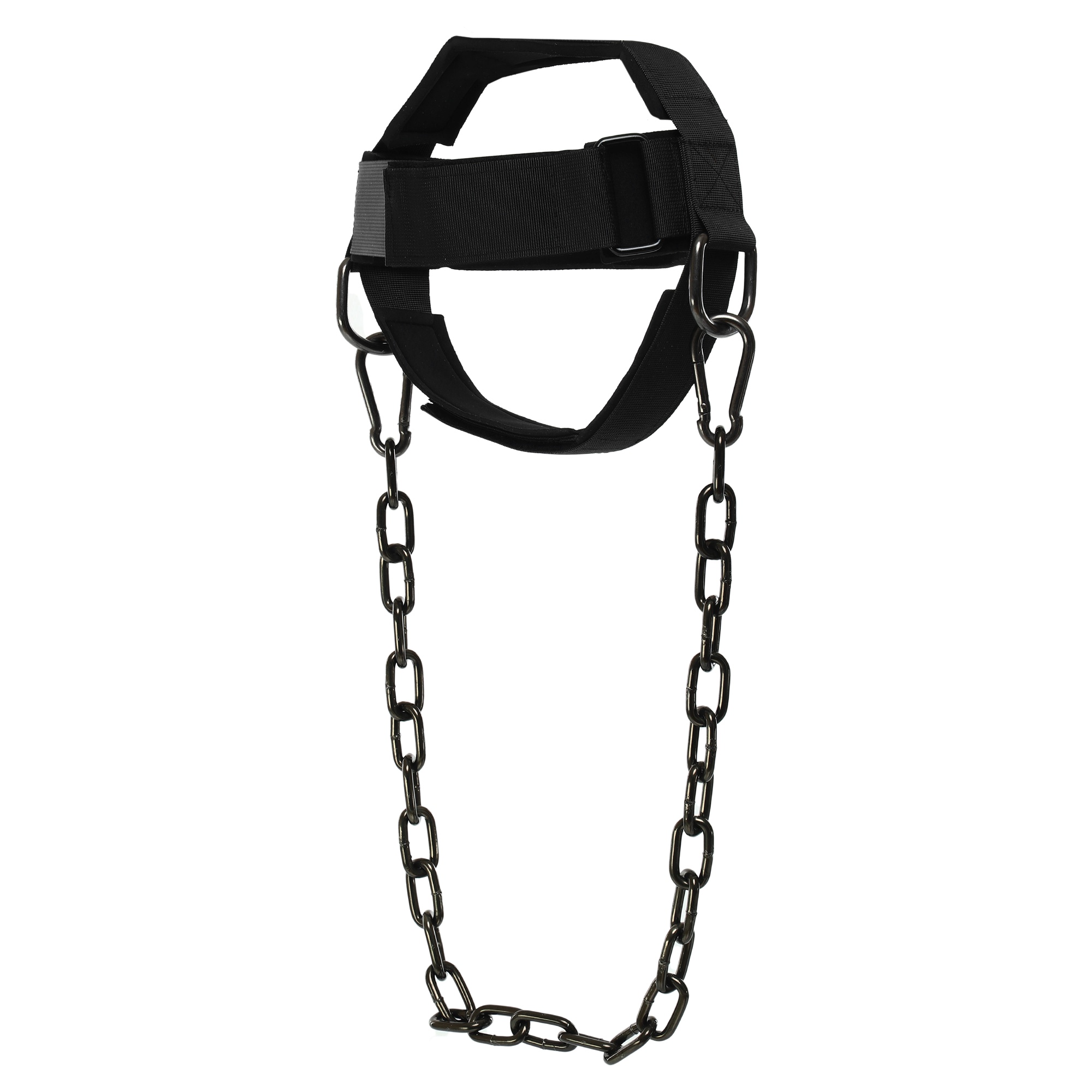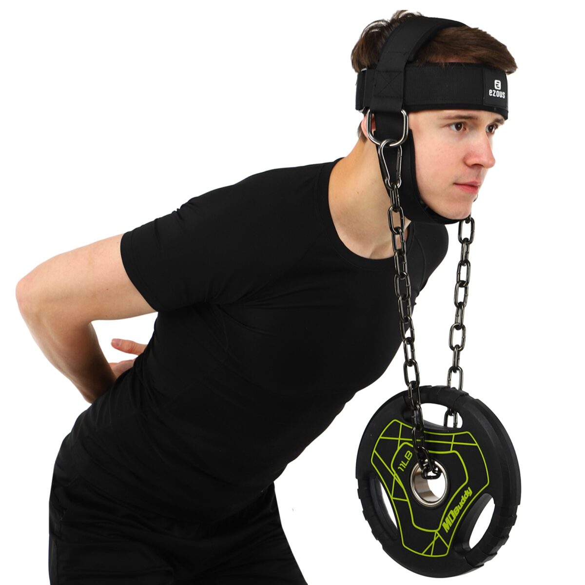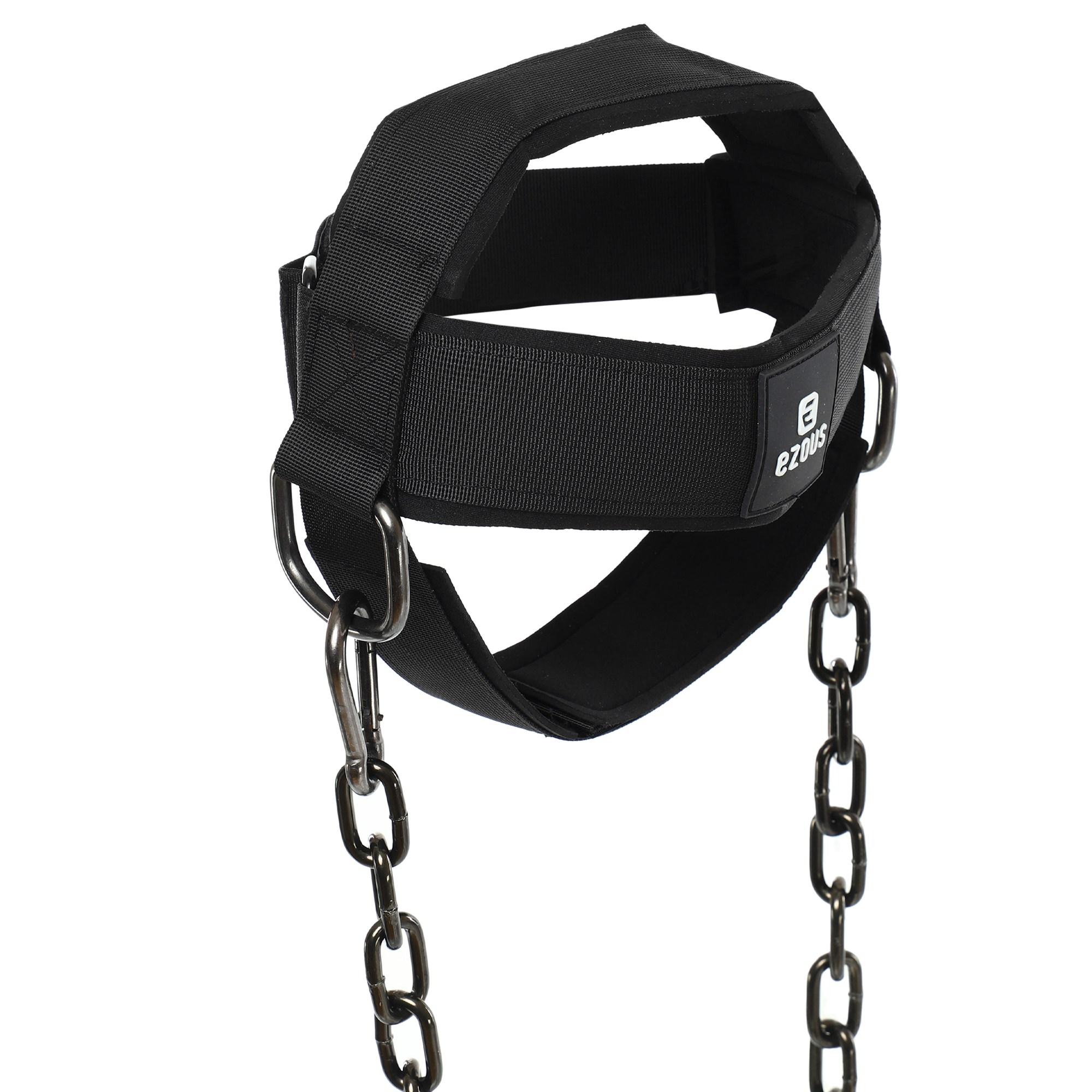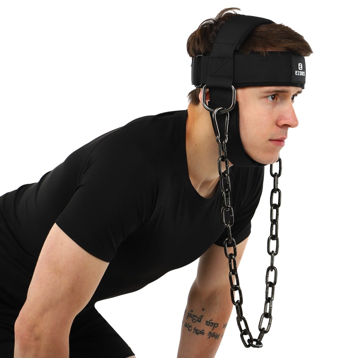 NECK HARNESS EZOUS — это удобный аксессуар, который позволяет нагрузить мышцы шеи. Упряжь состоит из специального крепления на голову, которое изготовлено из полиэстера. К креплению на голову с помощью карабина цепляется стальная цепь, на нее можно подвесить дополнительное отягощение. В качестве отягощения при выполнении упражнений с упряжью можно использовать диски от штанги или гантели. Вес отягощения необходимо постепенно увеличивать, чтобы не травмировать мышцы шеи. Удобное крепление на голову регулируется по посадке и фиксируется с помощью липучки. Карабины есть на обоих концах цепи.