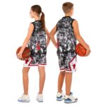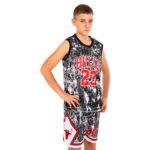 Комплект баскетбольной формы включает шорты и майку, изготовленные из полиэстера. И шорты, и майка имеют свободный крой и обеспечивают игроку возможность свободно двигаться по площадке, совершать ускорения, различные броски и другие движения. Эластичная резинка на шортах обеспечивает надёжную фиксацию на поясе, также в этой области присутствует шнурок для регулировки по посадке. Майка имеет круглый вырез горловины, который дарит свободу движения. Дизайн формы очень яркий, на ней имеется символика и название популярной баскетбольной команды Chicago Bulls.