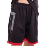 Шорты имеют оптимальную длину, которая обеспечивает свободу движений и комфорт. Они не слишком длинные, что позволяет легко передвигаться по площадке и выполнять различные маневры, не испытывая дискомфорта. Внутренний пояс шорт имеет эластичную резинку, которая надежно фиксирует шорты на талии, не причиняя при этом дискомфорта. Дизайн шорт включает в себя элементы, перекликающиеся с дизайном майки, что создает гармоничный и стильный комплект.
