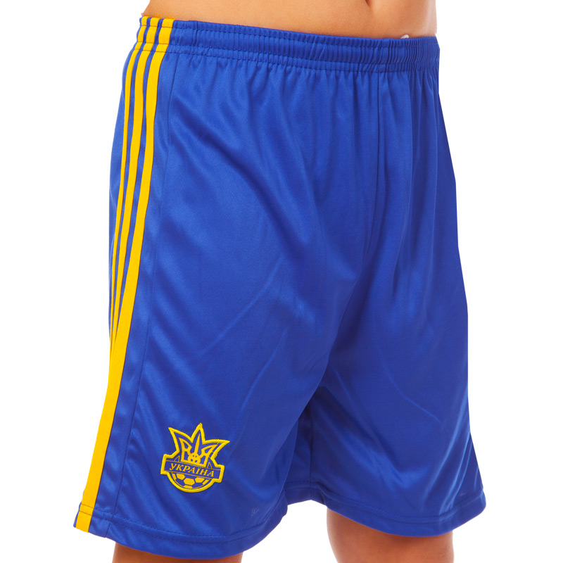 Шорты также изготовлены из полиэстера и способствуют свободе движений благодаря просторному крою. Они оснащены эластичным поясом для удобной посадки и фиксации на талии. На боковой части шорт присутствует эмблема сборной Украины, что делает их идеальными для спортивных тренировок и игр.