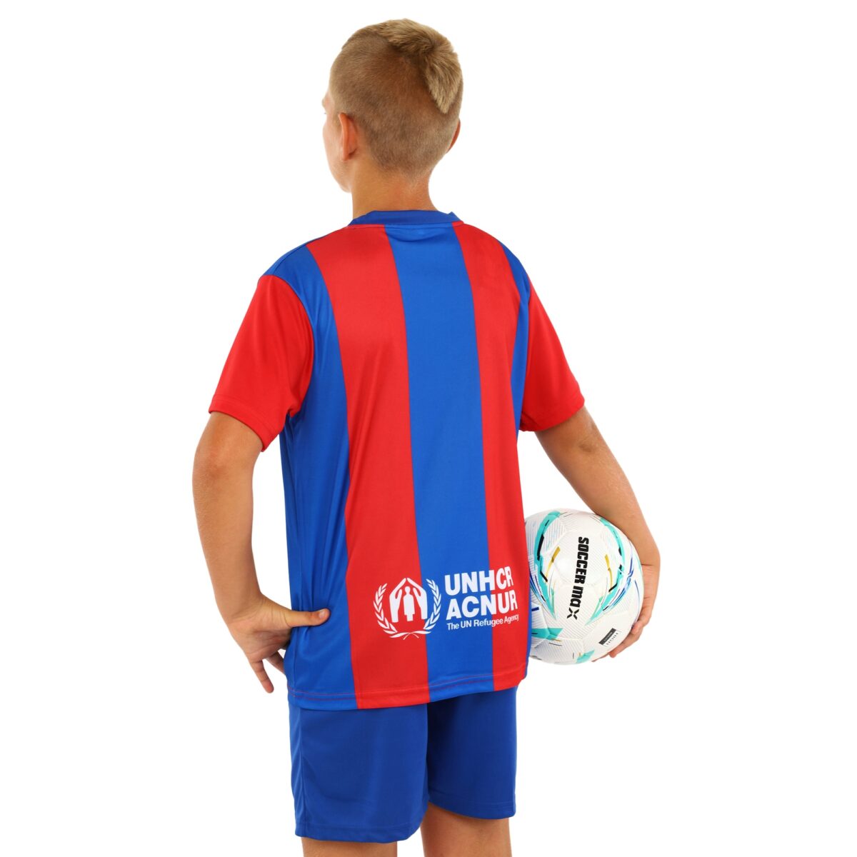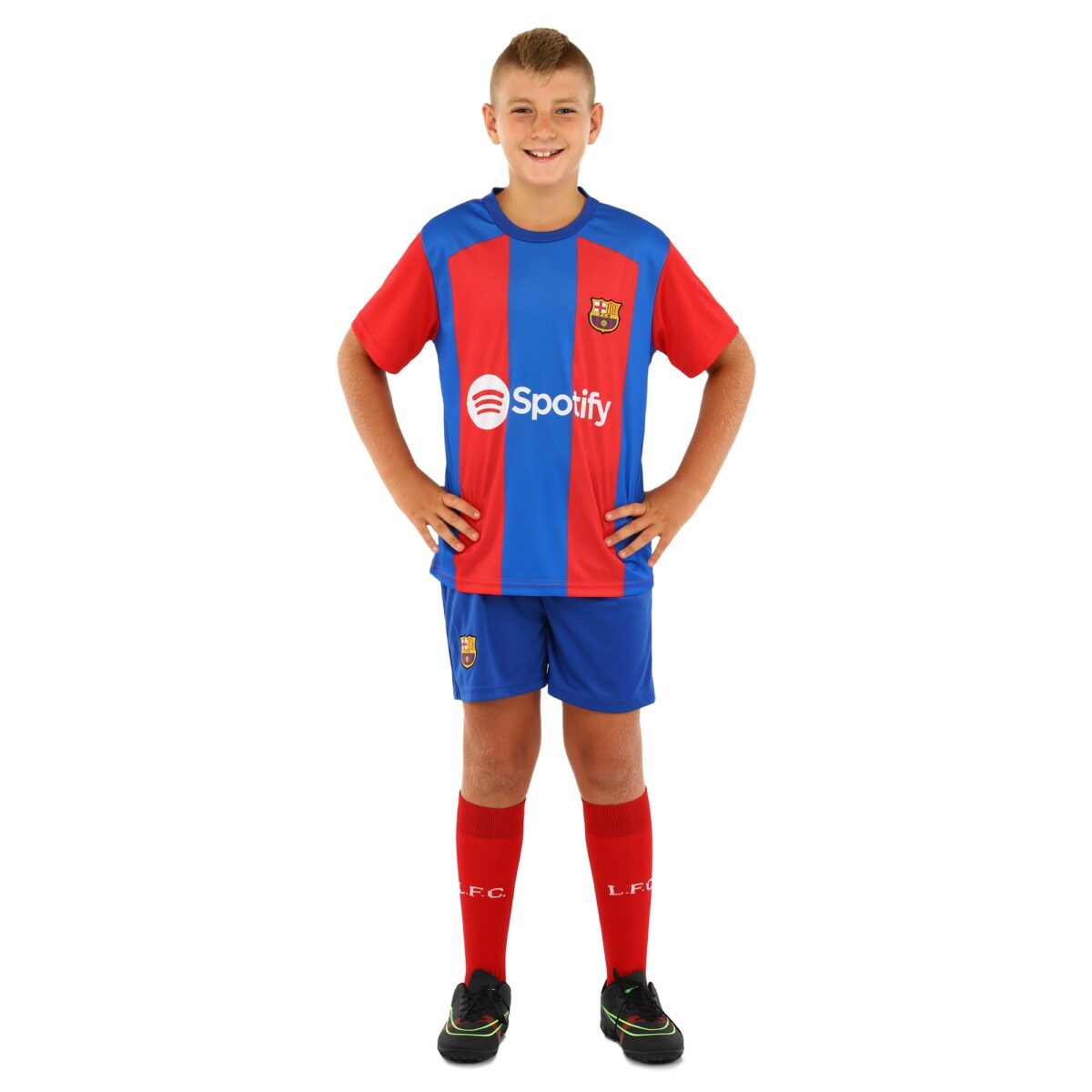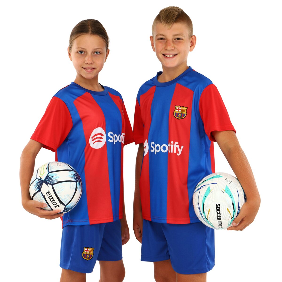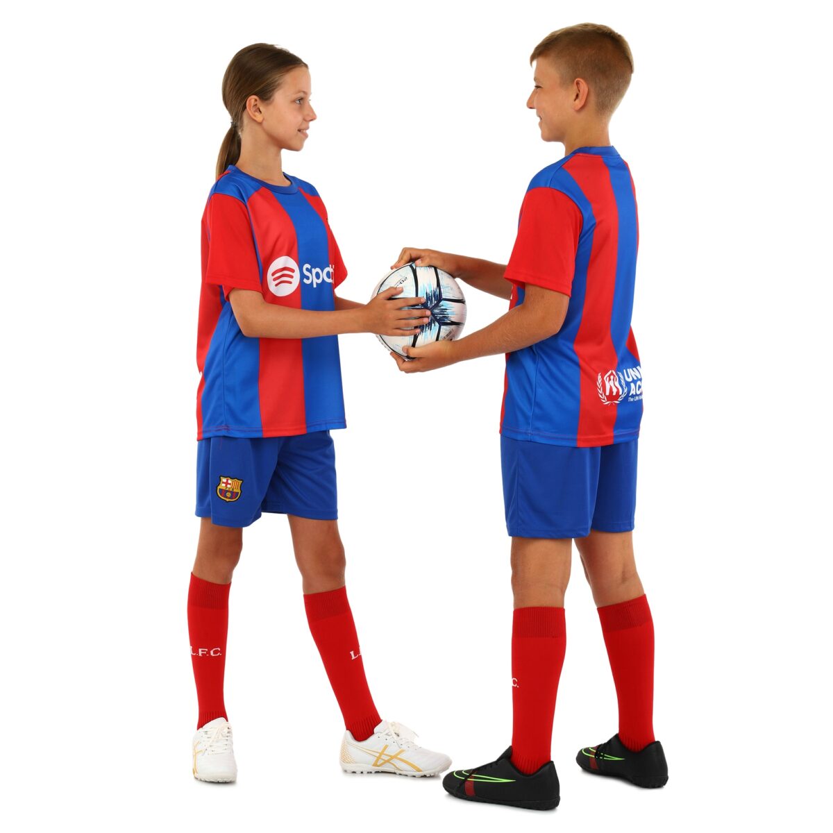 Детская форма с символикой футбольного клуба BARCELONA сделана для молодых поклонников футбола, которые активно участвуют в тренировках или играх.