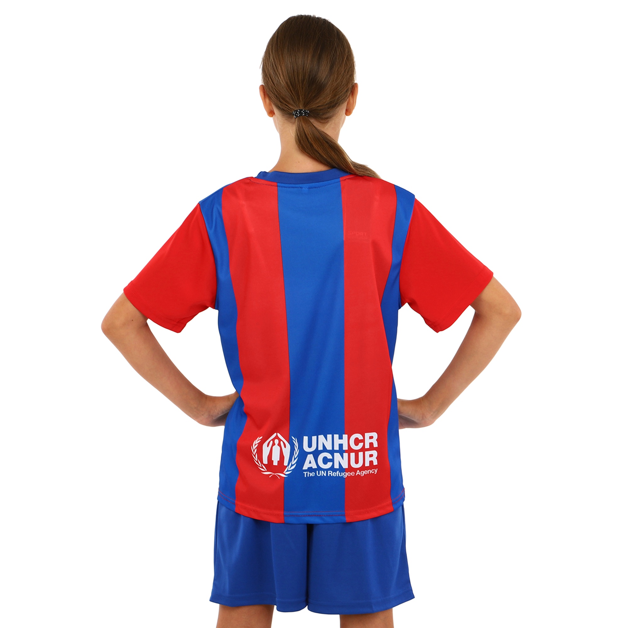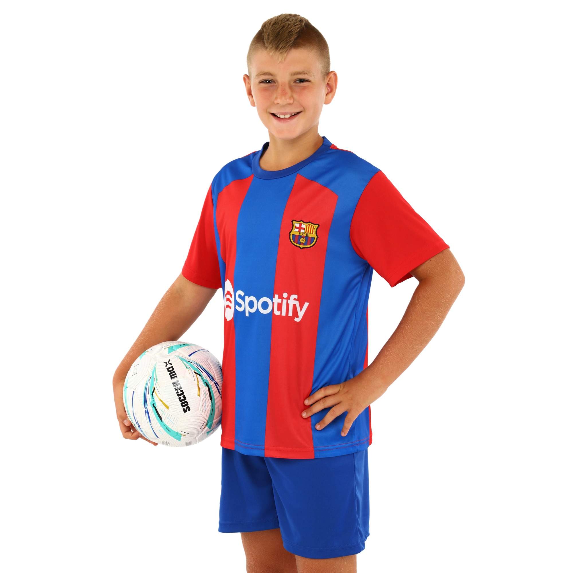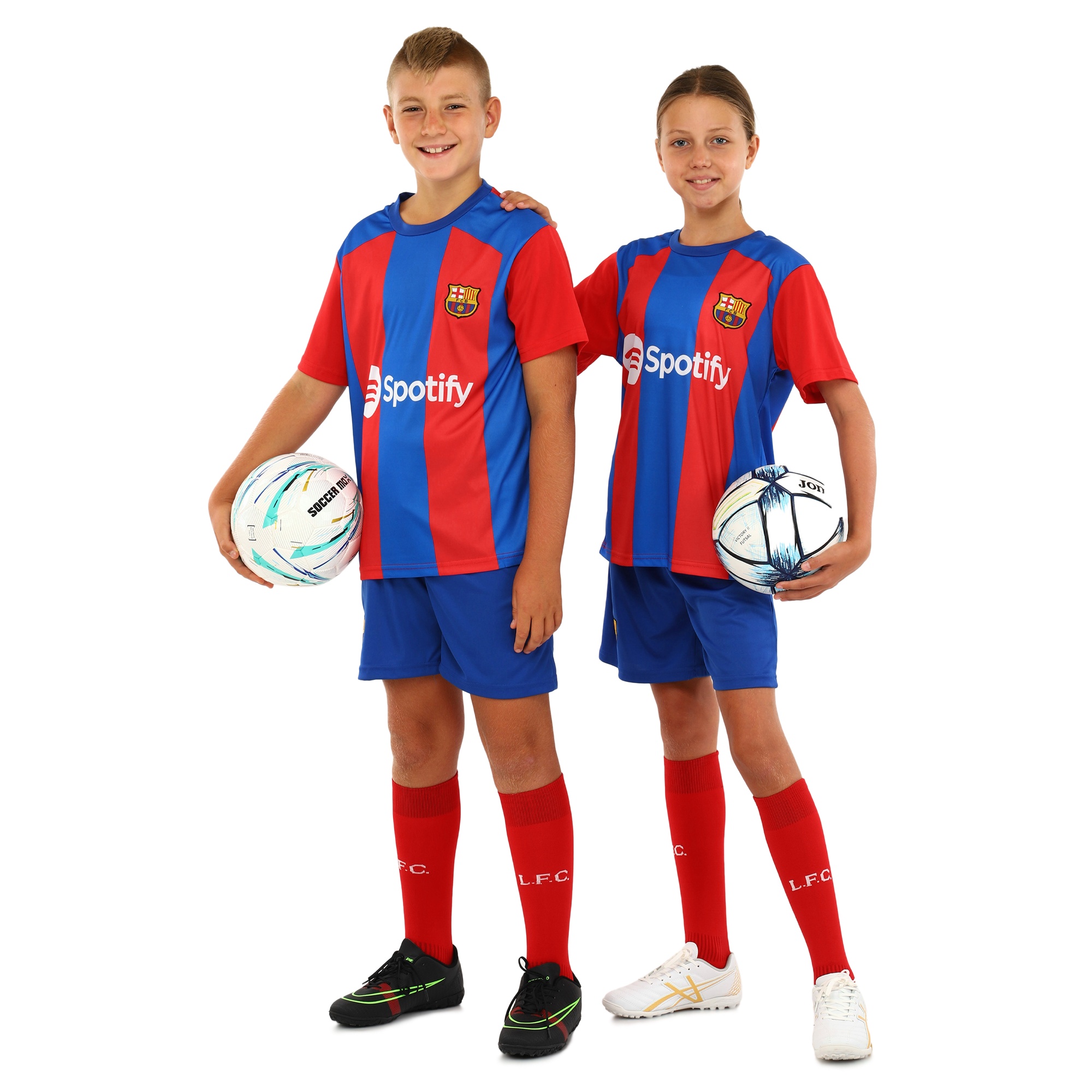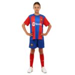 Детская форма с символикой футбольного клуба BARCELONA сделана для молодых поклонников футбола, которые активно участвуют в тренировках или играх.
