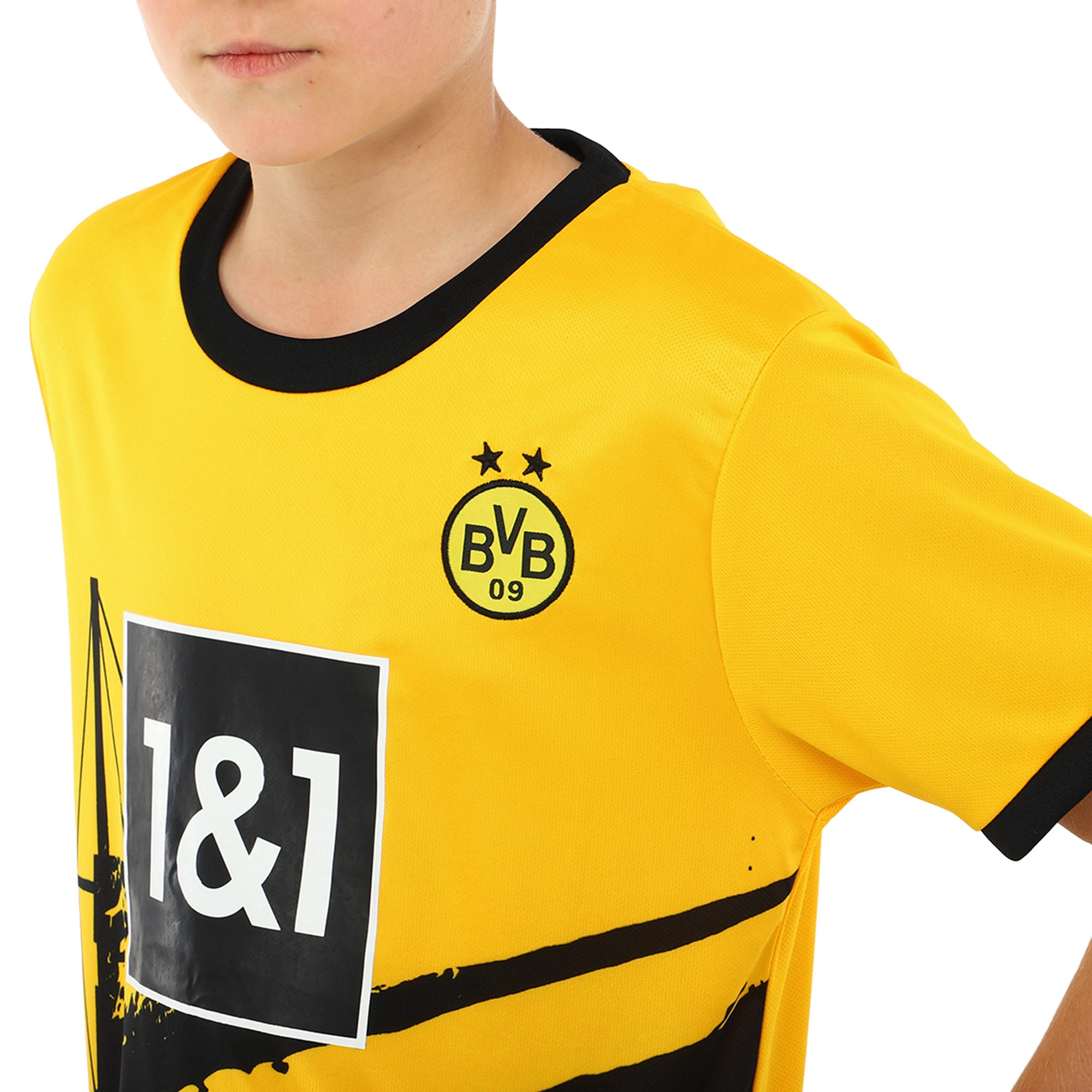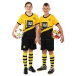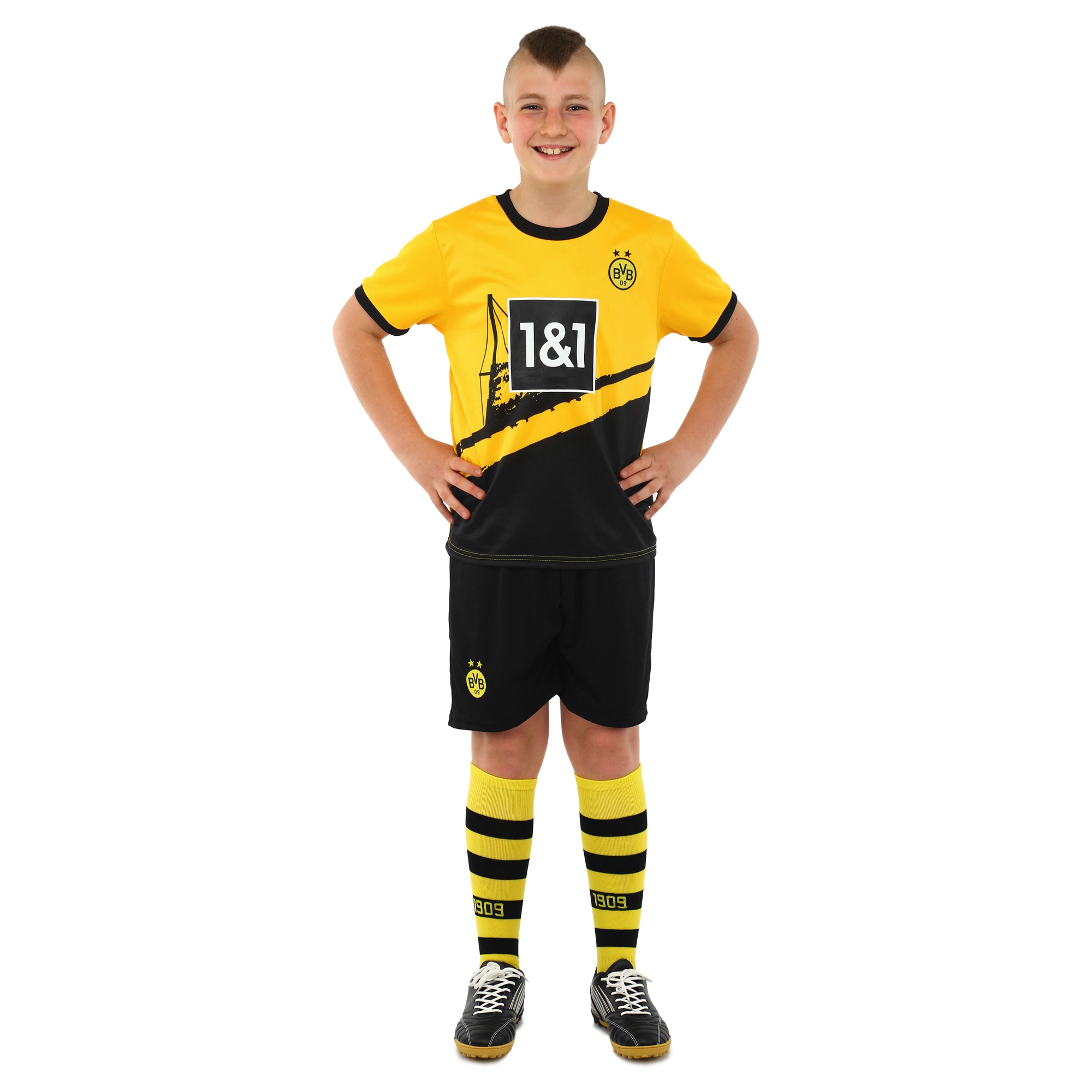 Домашняя форма футбольного клуба BORUSSIA DORTMUND изготовлена в ярких цветах. В ней преобладает желтый цвет, также присутствует черный цвет. Форма состоит из футболки и шорт, которые можно использовать как во время тренировок по футболу, так и для игр и развлечений. Форма предназначена для детей. Из большого ассортимента размеров можно выбрать форму на детей в возрасте от 6 лет до 14 лет.