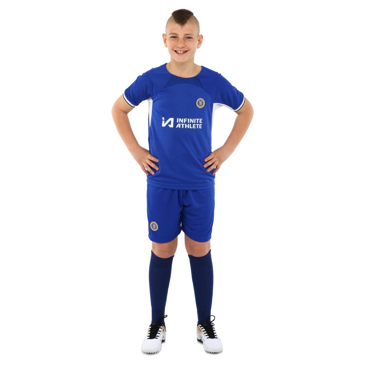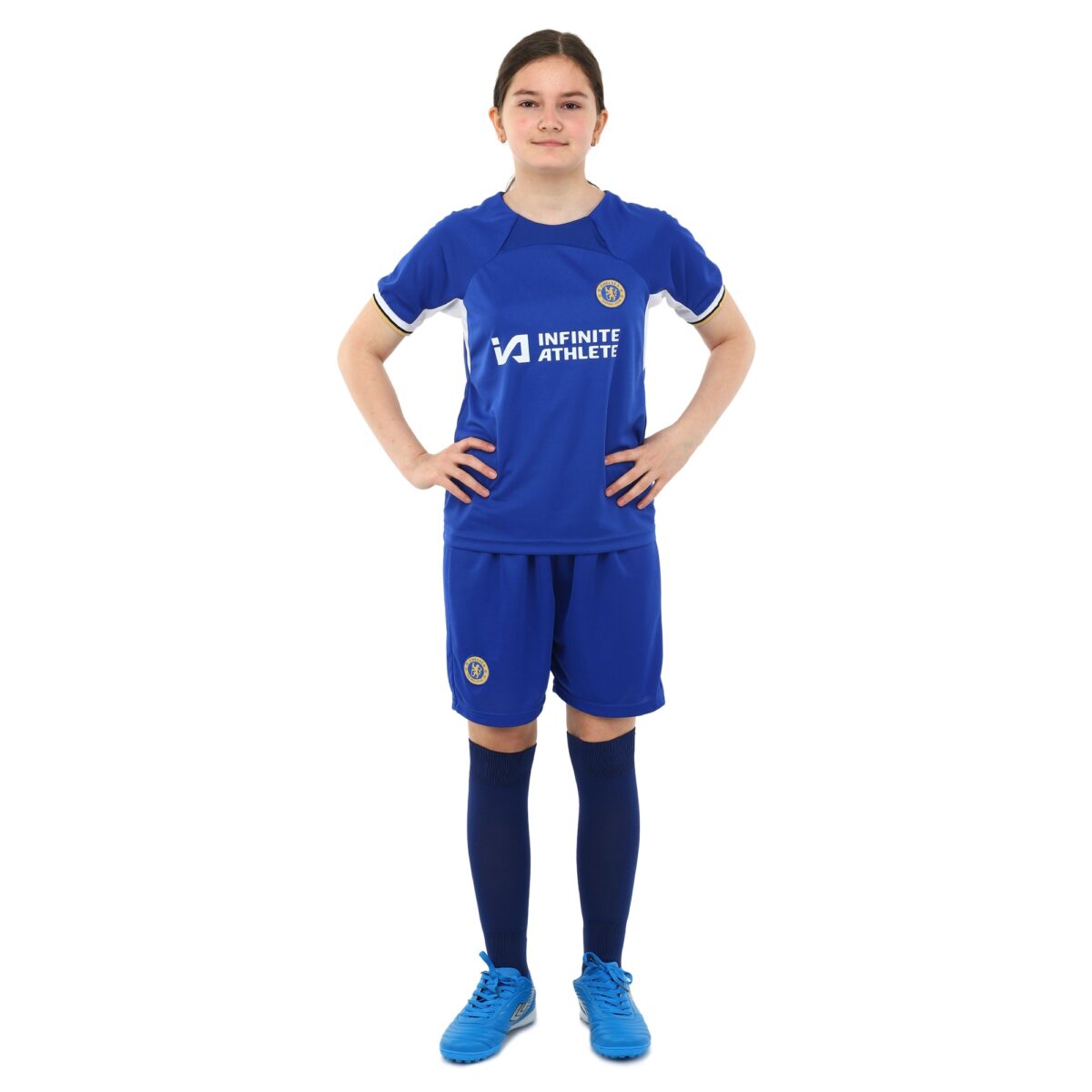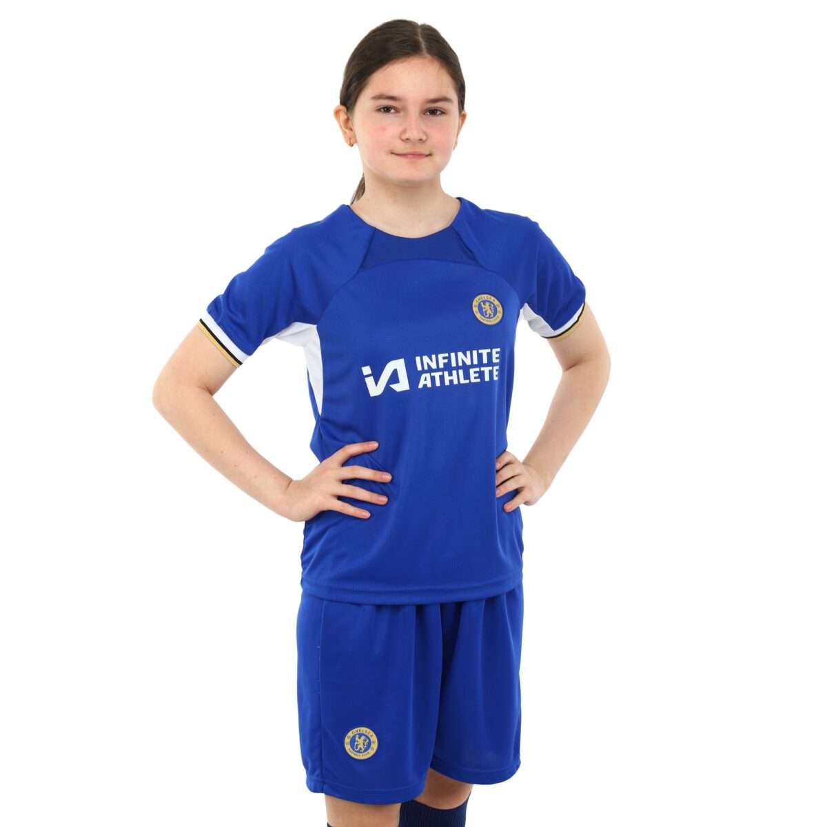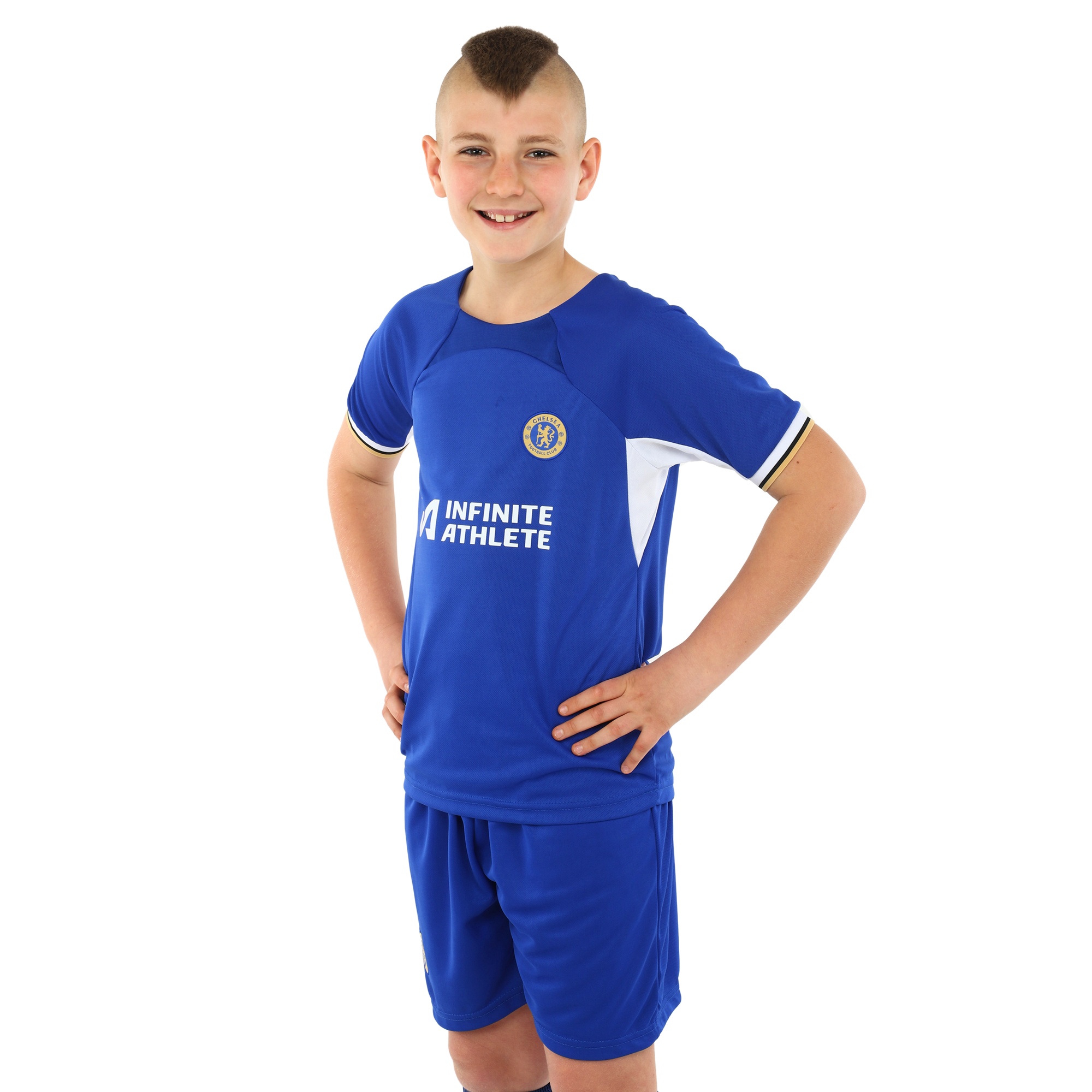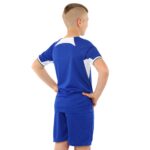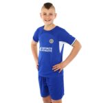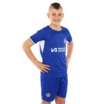 Домашняя футбольная форма клуба CHELSEA предназначена для детей. Она состоит из шорт на резинке и футболки с коротким рукавом. Шорты регулируются по посадке на поясе и имеют удобный крой, который позволяет совершать любые движения ногами, делать рывки и ускорения. Футболка с круглым вырезом имеет свободный крой и также не ограничивает спортсмена в движениях.