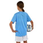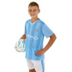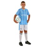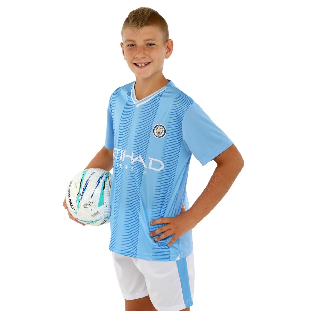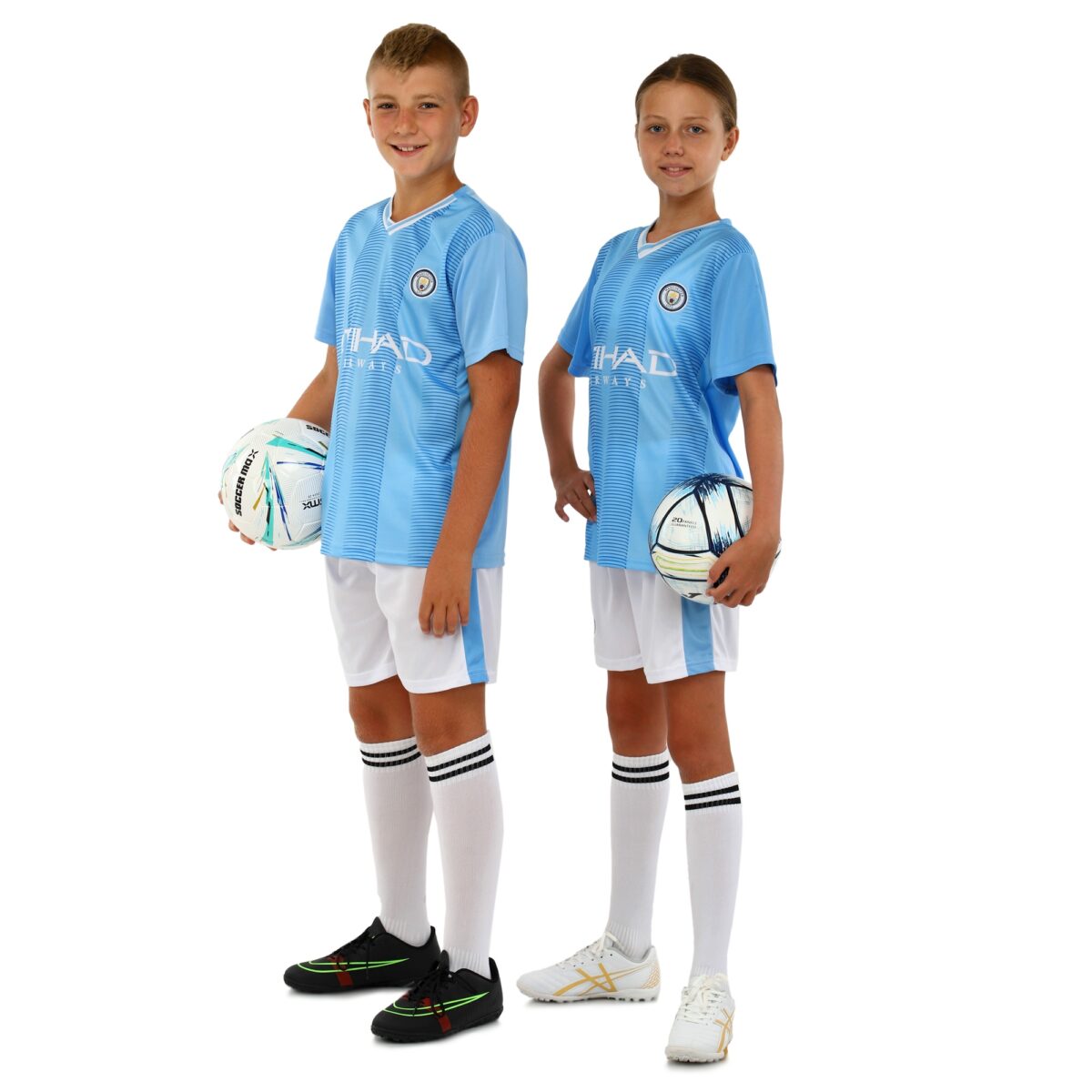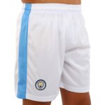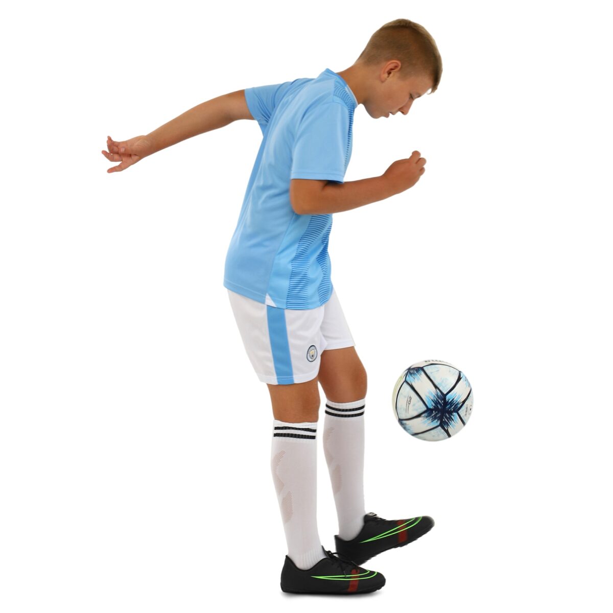 Футболка не ограничивает свободы движений благодаря своему прямому крою с удлиненной спинкой, а шорты имеют удобный эластичный пояс с внутренним шнурком для регулировки посадки. Символика футбольного клуба Manchester City ярко выражена на футболке и шортах, что делает эту форму не только функциональной, но и стильной.