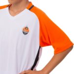 Футболка оснащена V-образным вырезом, который обеспечивает комфорт и свободу движений, а также придает изделию стильный и современный вид. В области груди расположена эмблема футбольного клуба ШАХТЕР, выполненная с высокой детализацией, что позволяет ребенку с гордостью демонстрировать свою привязанность к клубу. Крой футболки продуман до мелочей: она слегка приталена, чтобы сидеть по фигуре, но не стеснять движений, а рукава выполнены в оптимальной длине для комфортной игры.