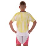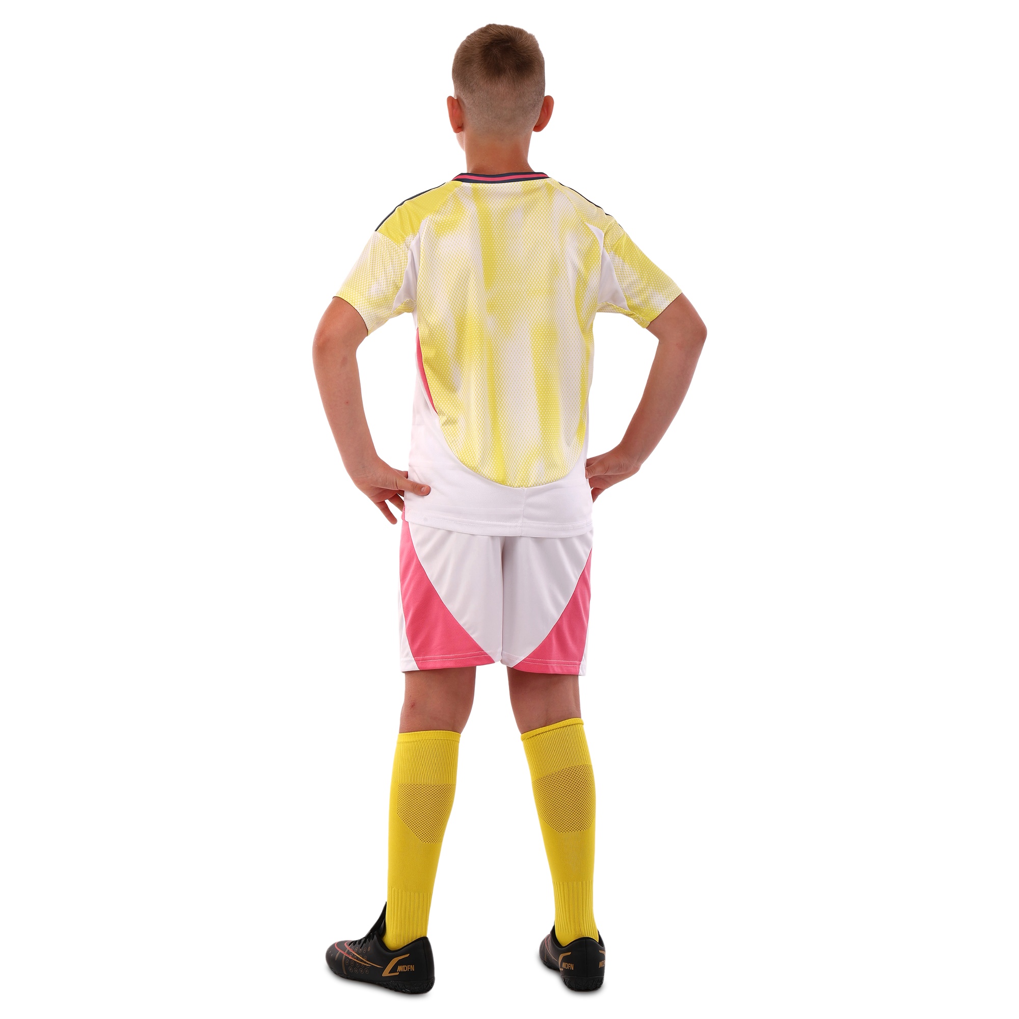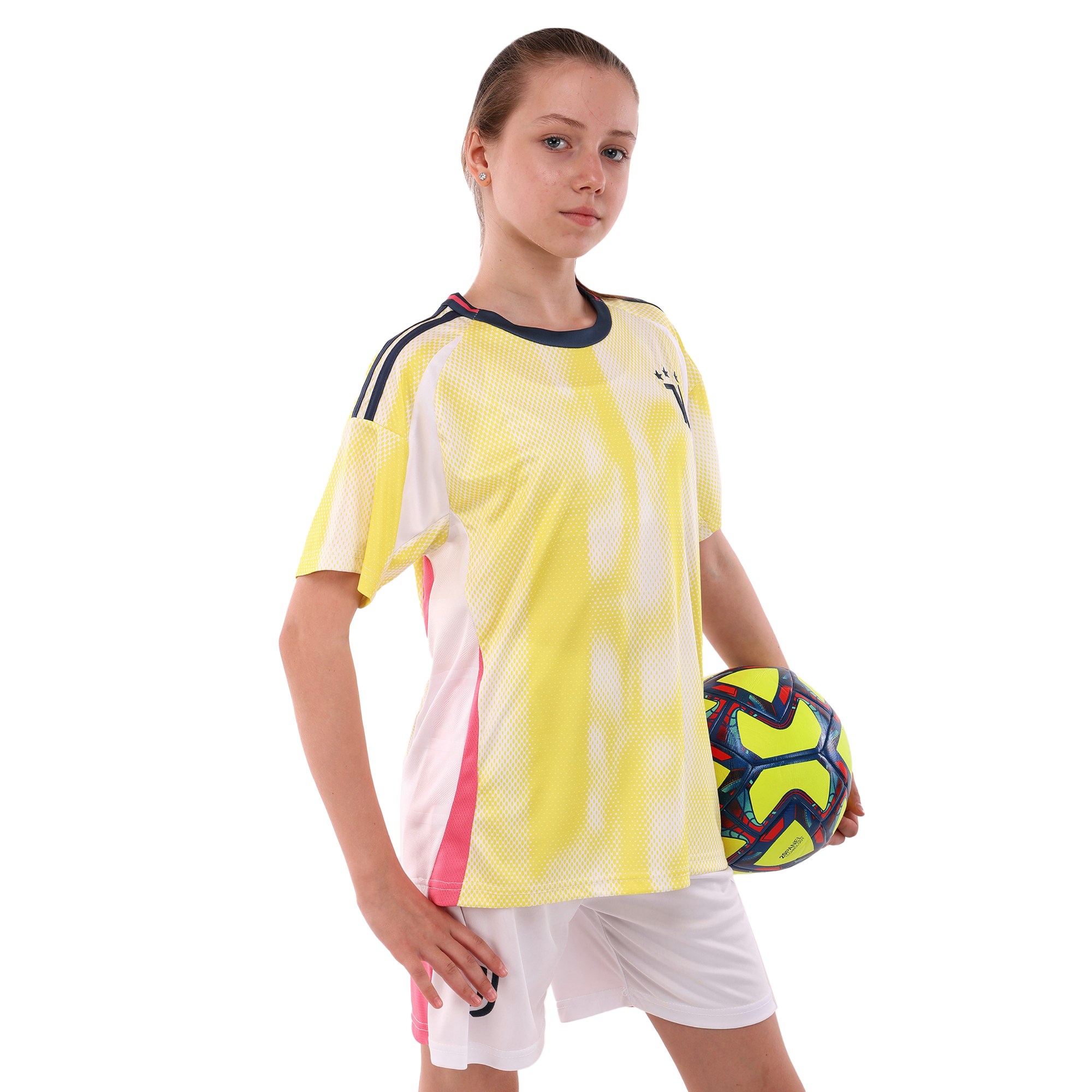 Набор включает в себя футболку с круглым вырезом и короткими рукавами, а также шорты. Оба элемента комплекта выполнены из лёгкого и прочного полиэстера. Материал хорошо пропускает воздух, обеспечивает быстрый отвод влаги и сохраняет насыщенность цветов на протяжении длительного времени. Форма представлена множеством размеров и подходит для детей разных возрастов.