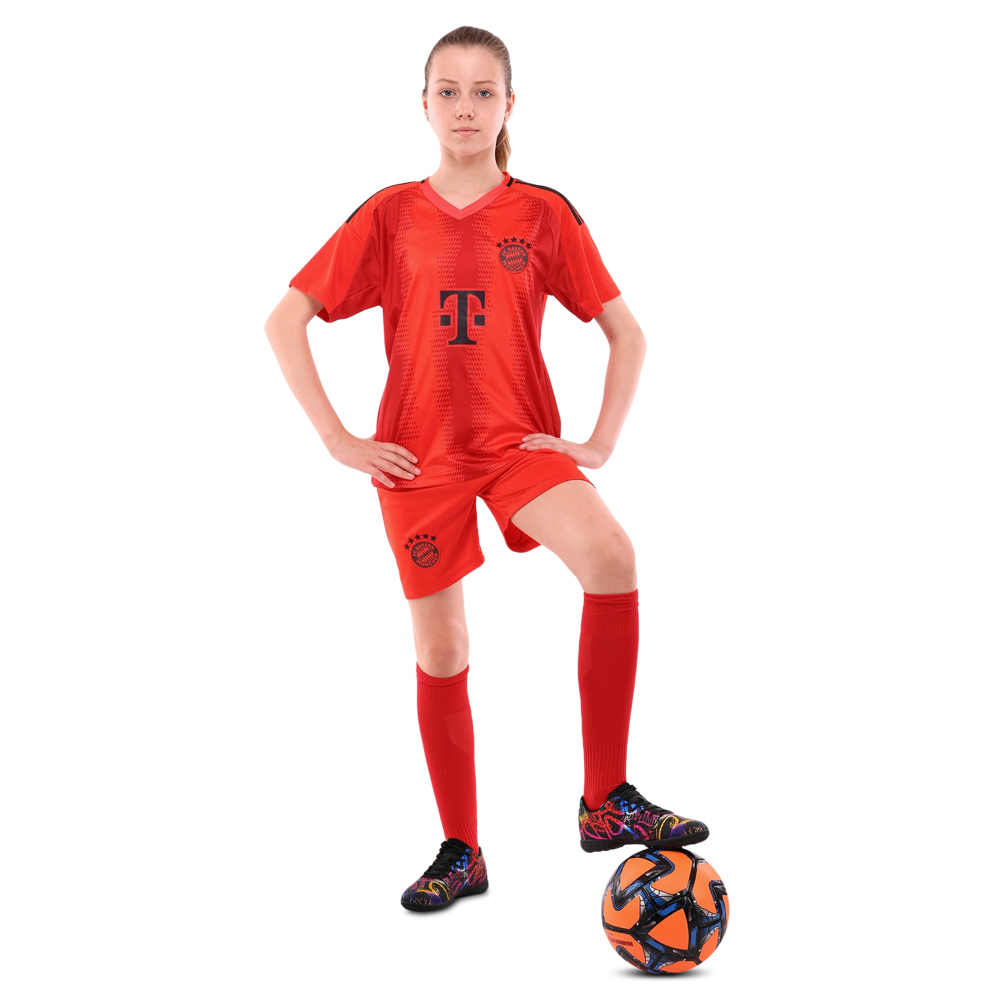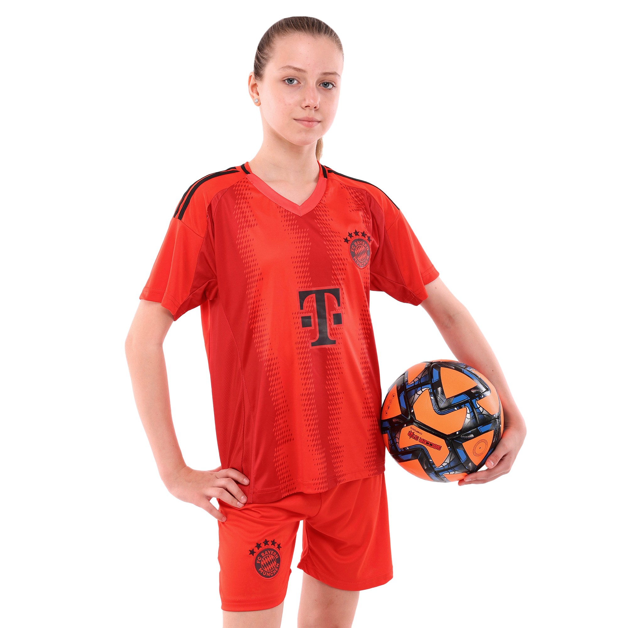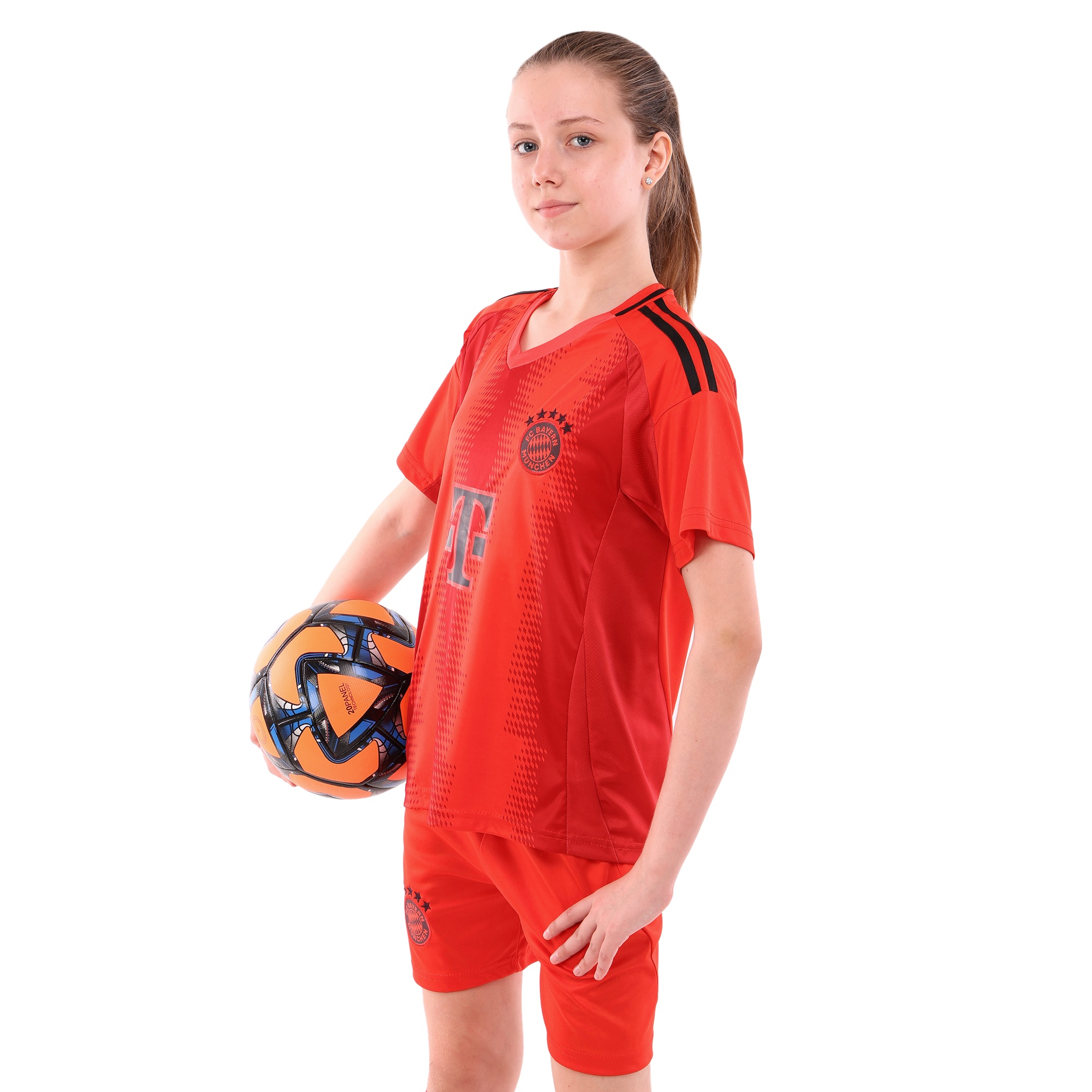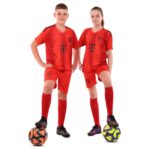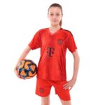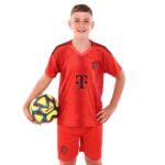 Детская футбольная форма обеспечивает максимальный комфорт и позволяет детям свободно двигаться и достигать успехов на поле. Комплект состоит из футболки с коротким рукавом и шорт с эластичной резинкой, украшенных символикой известного футбольного клуба BAYERN MUNCHEN.