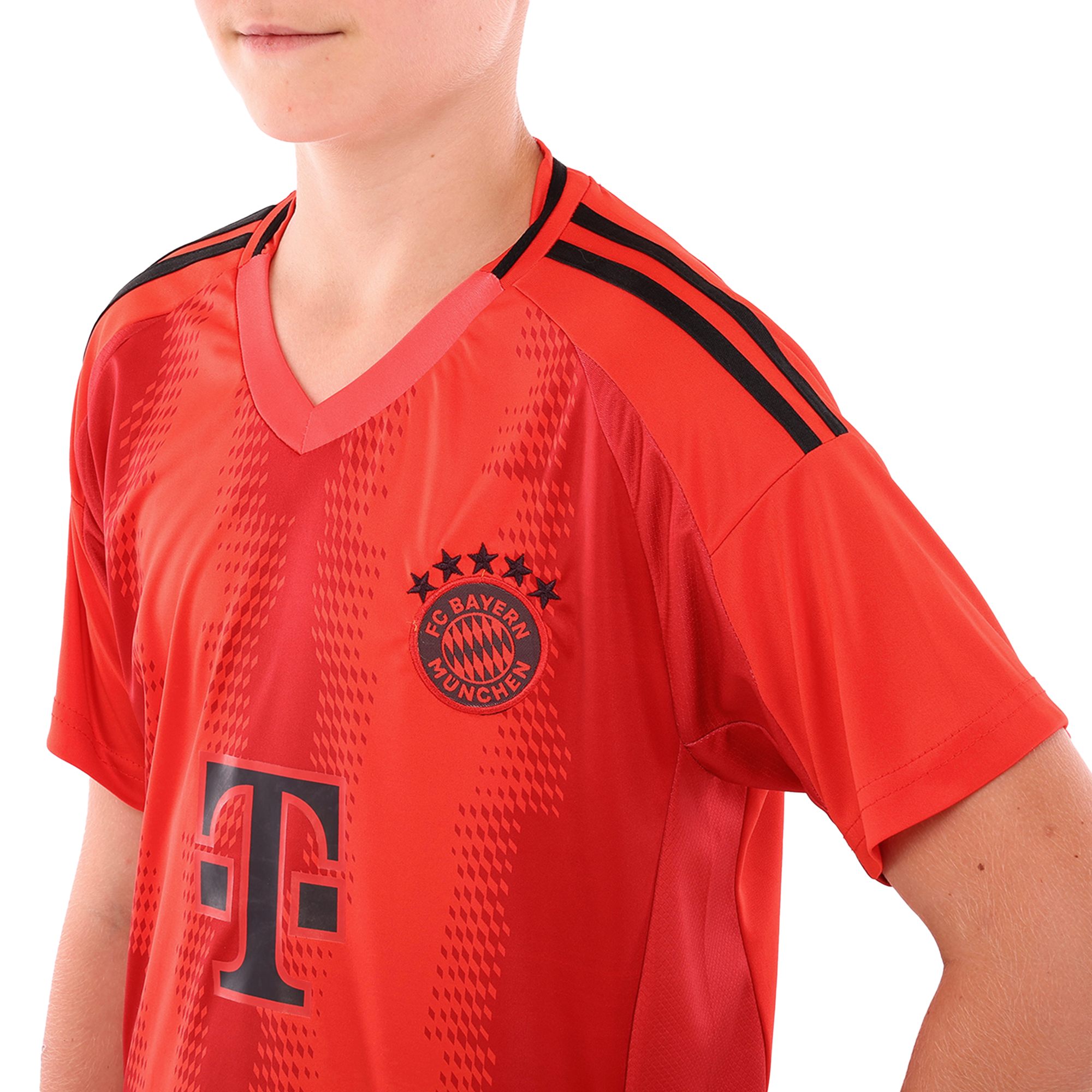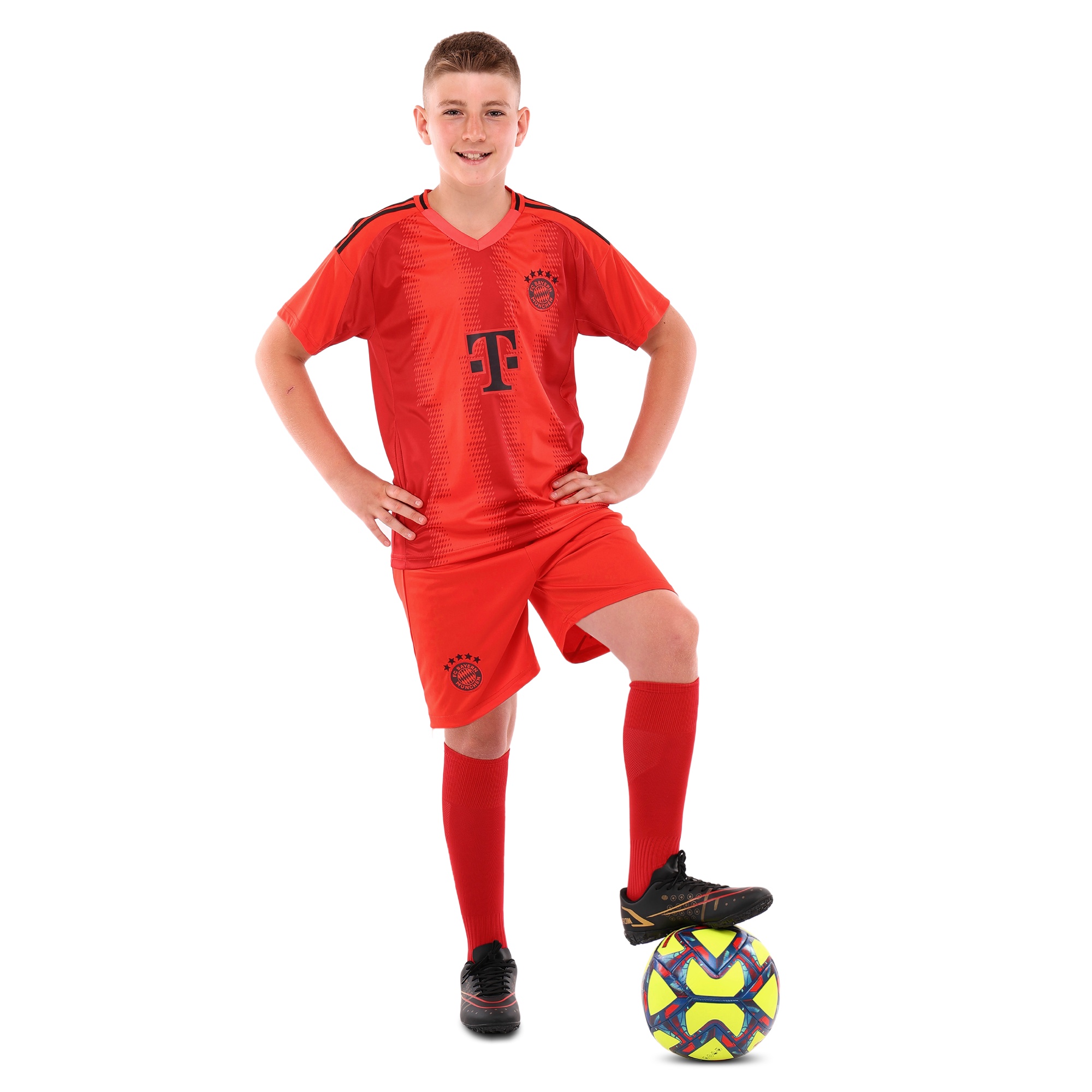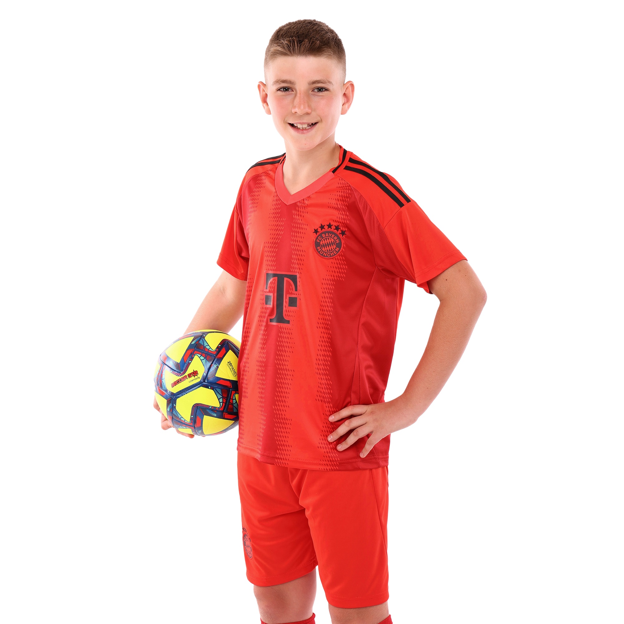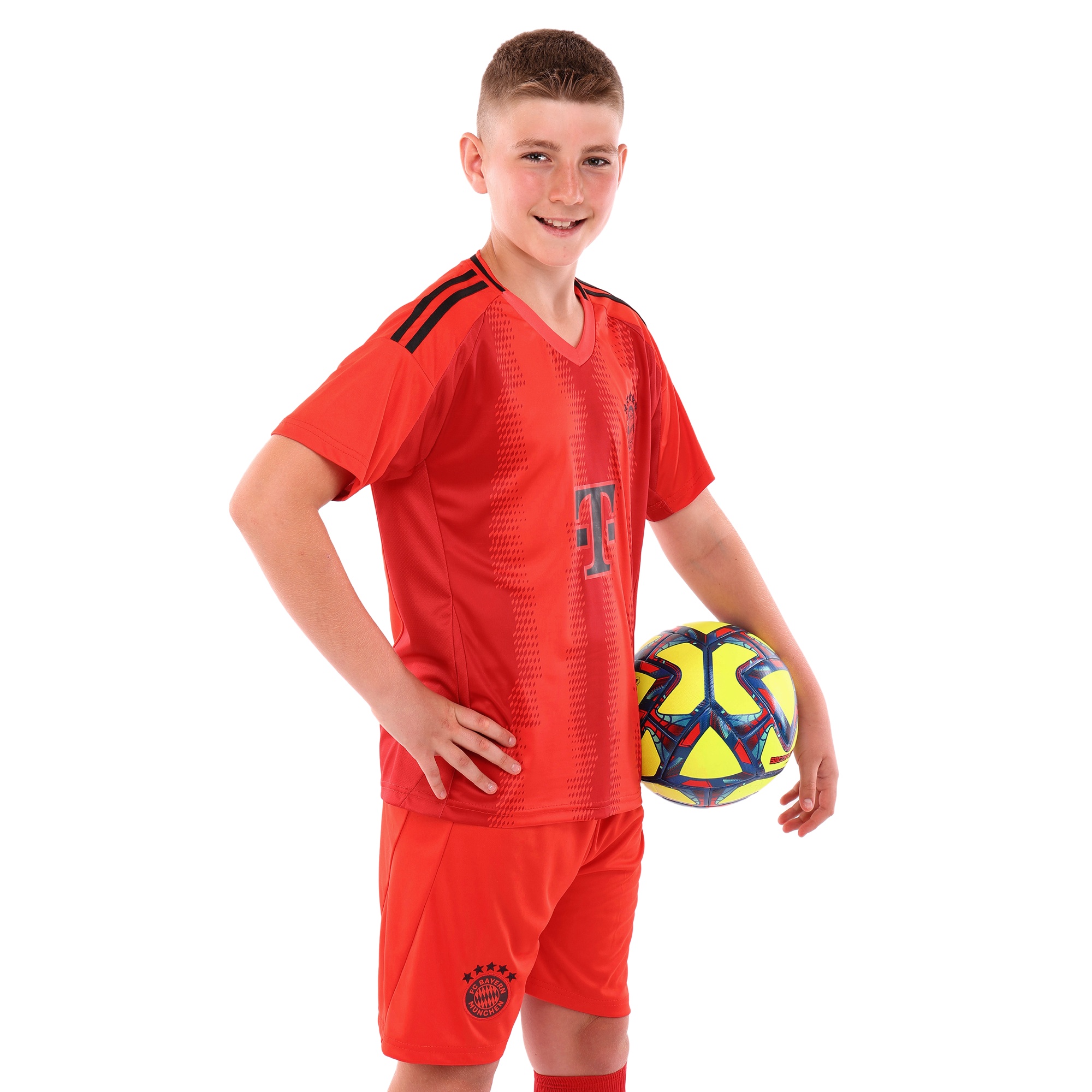 Детская футбольная форма обеспечивает максимальный комфорт и позволяет детям свободно двигаться и достигать успехов на поле. Комплект состоит из футболки с коротким рукавом и шорт с эластичной резинкой, украшенных символикой известного футбольного клуба BAYERN MUNCHEN.
