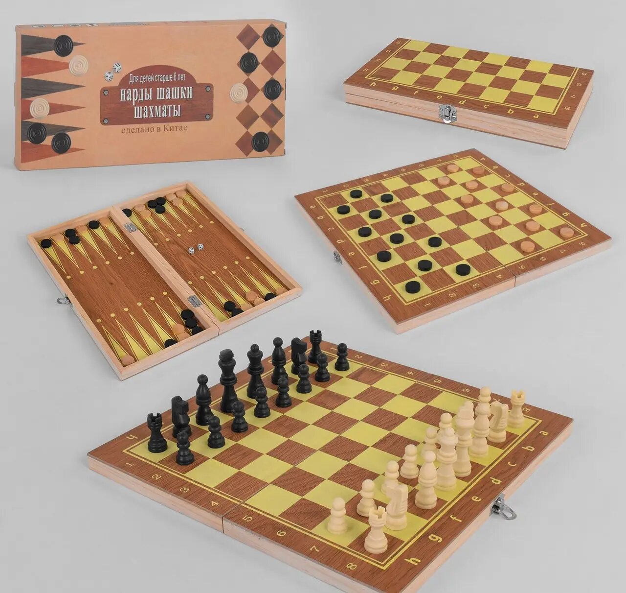 Шахматы 3в1 представляют собой комплект из трех игр: шахматы, нарды и шашки.