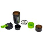 Шейкер состоит из основной ёмкости для смешивания коктейлей и двух съёмных контейнеров для хранения добавок. Один из них оснащён специальной вставкой, разделённой на три части, что позволяет взять с собой несколько разных добавок. Все они имеют резьбу и последовательно соединяются между собой в единую конструкцию. Закрывается шейкер герметичной крышкой. Тщательность перемешивания ингредиентов коктейля обеспечивает специальная вставка – конусообразная сеточка с венчиком, который не позволяет порошку сбиться в комки.