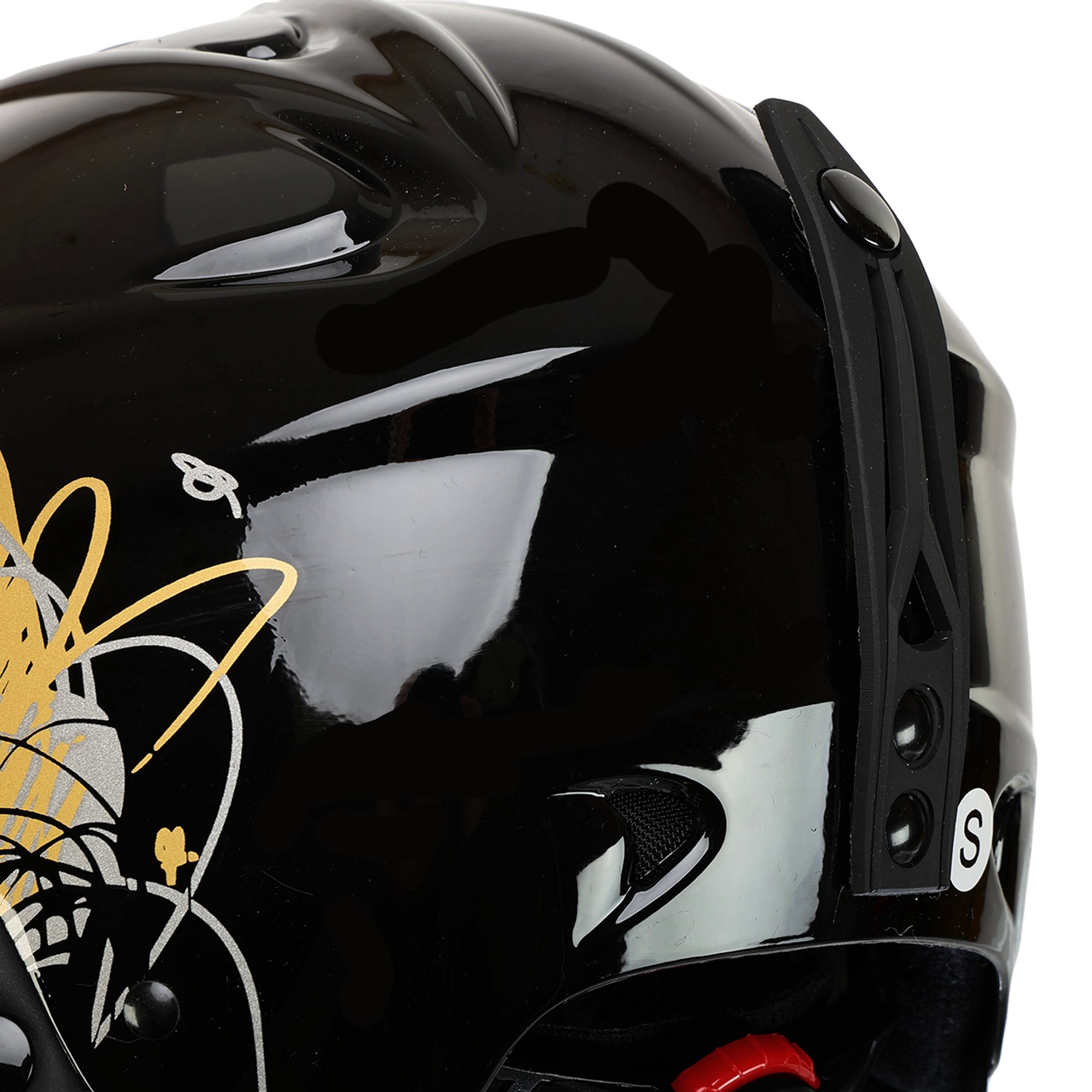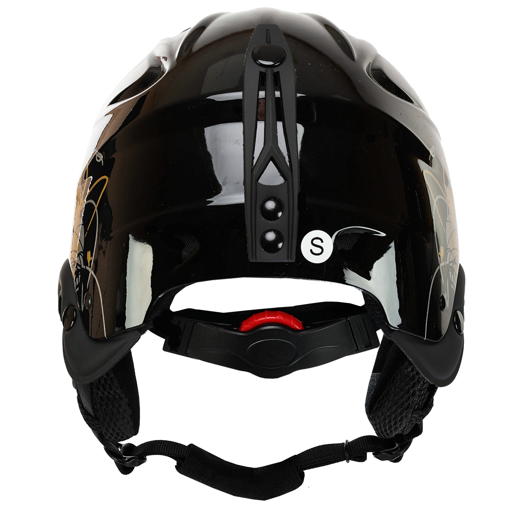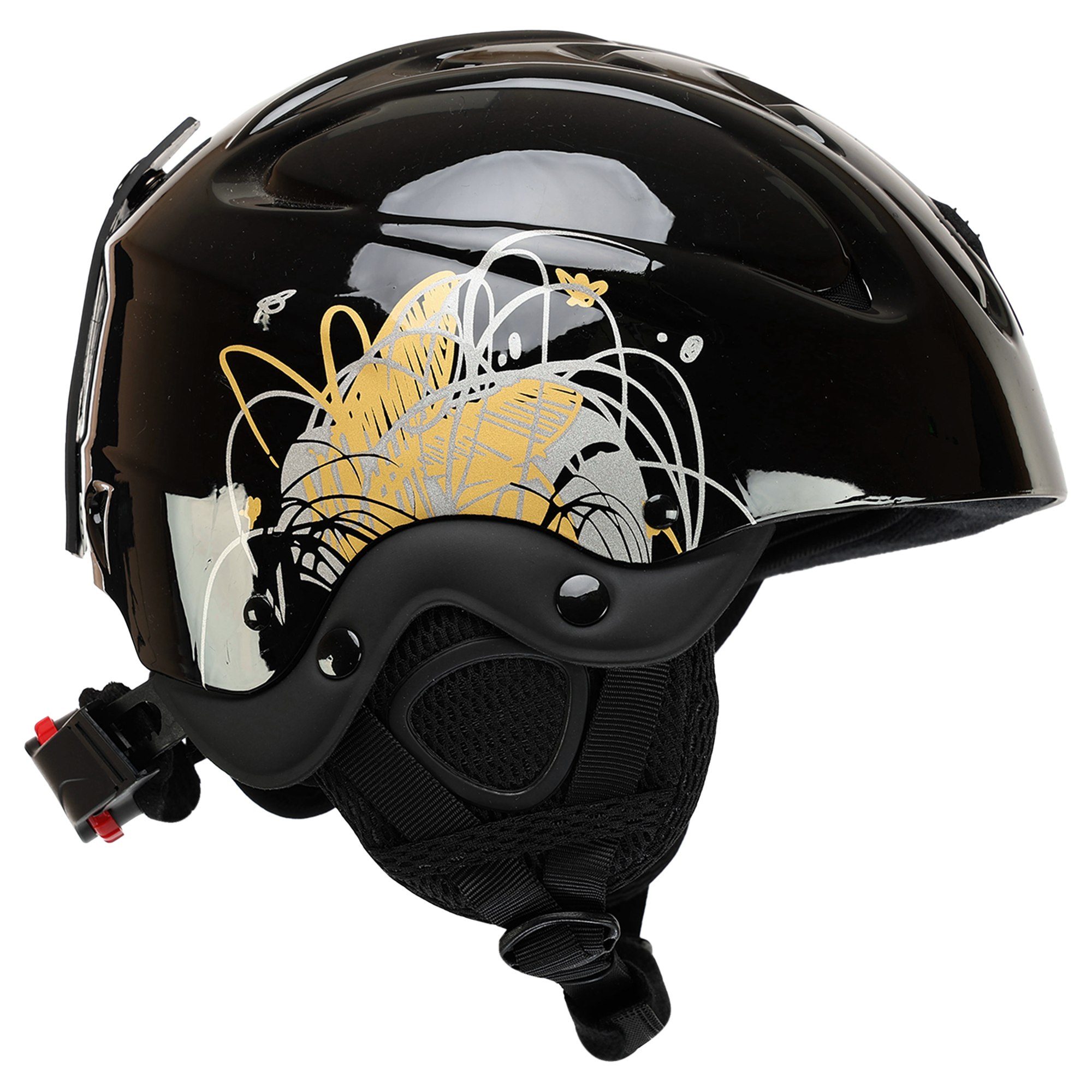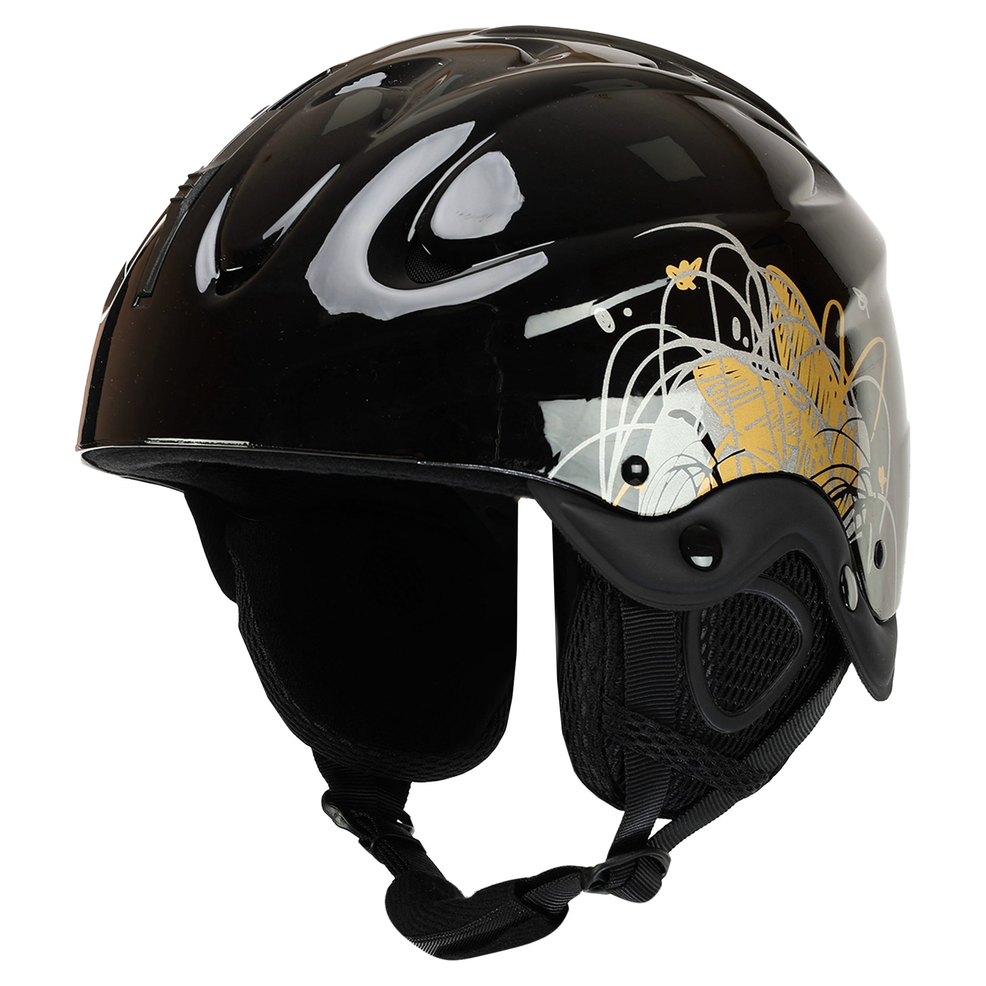 Для надежной фиксации используется регулируемый ремешок с мягкой подкладкой и застежкой-фастекс. Благодаря поворотной системе регулировки размера шлем легко подгоняется под индивидуальные параметры головы, обеспечивая плотное и удобное прилегание. Выполнен в универсальном черном цвете с элегантным декором в золотых и серых тонах, что делает его стильным аксессуаром для любого райдера.