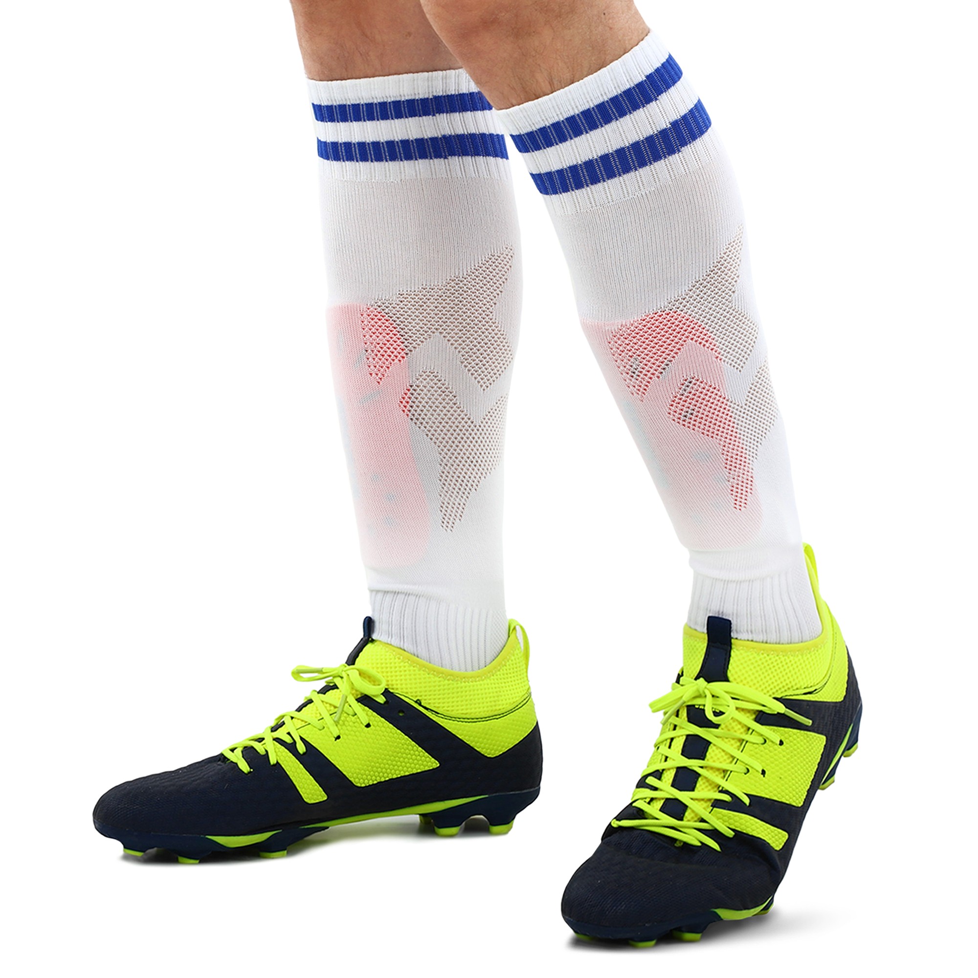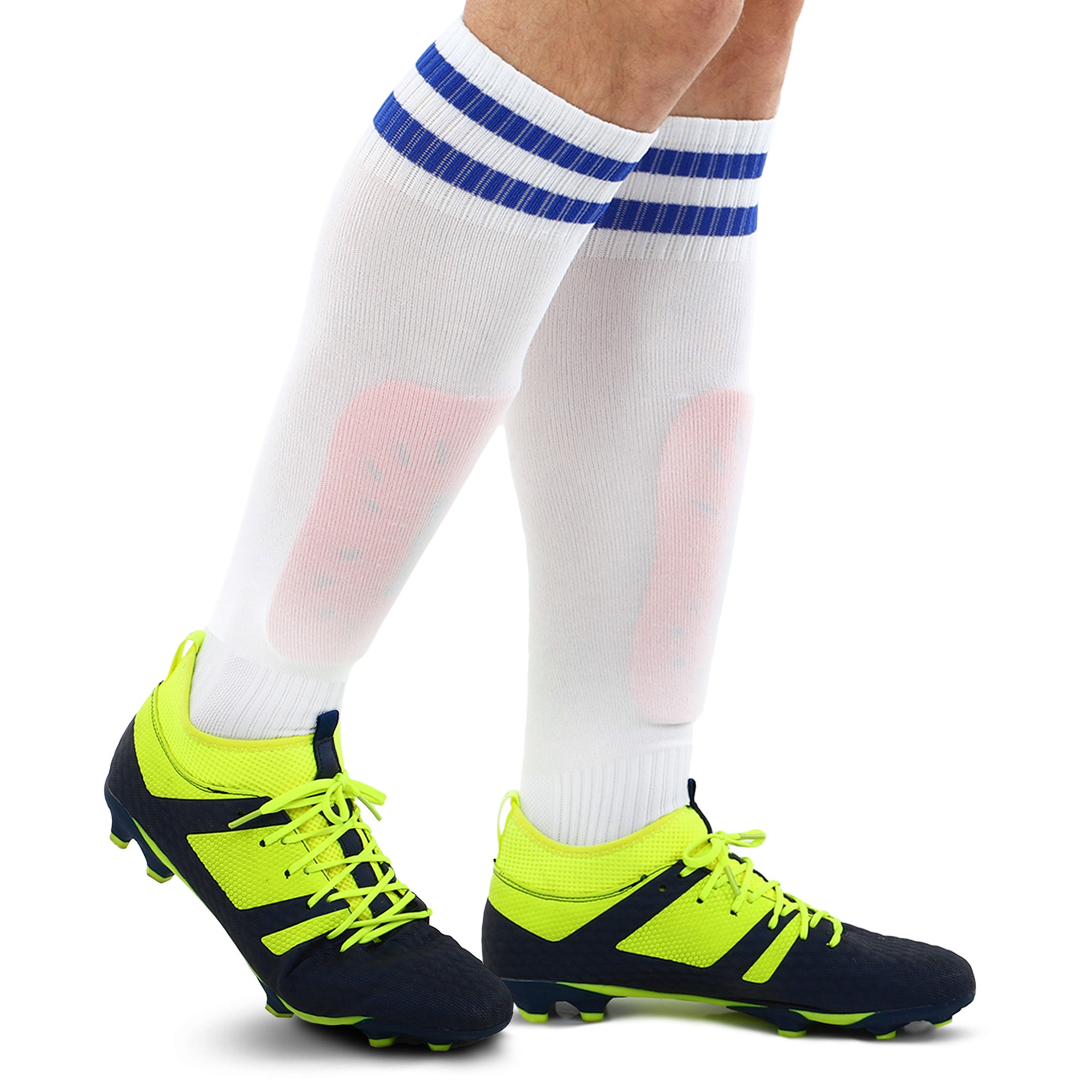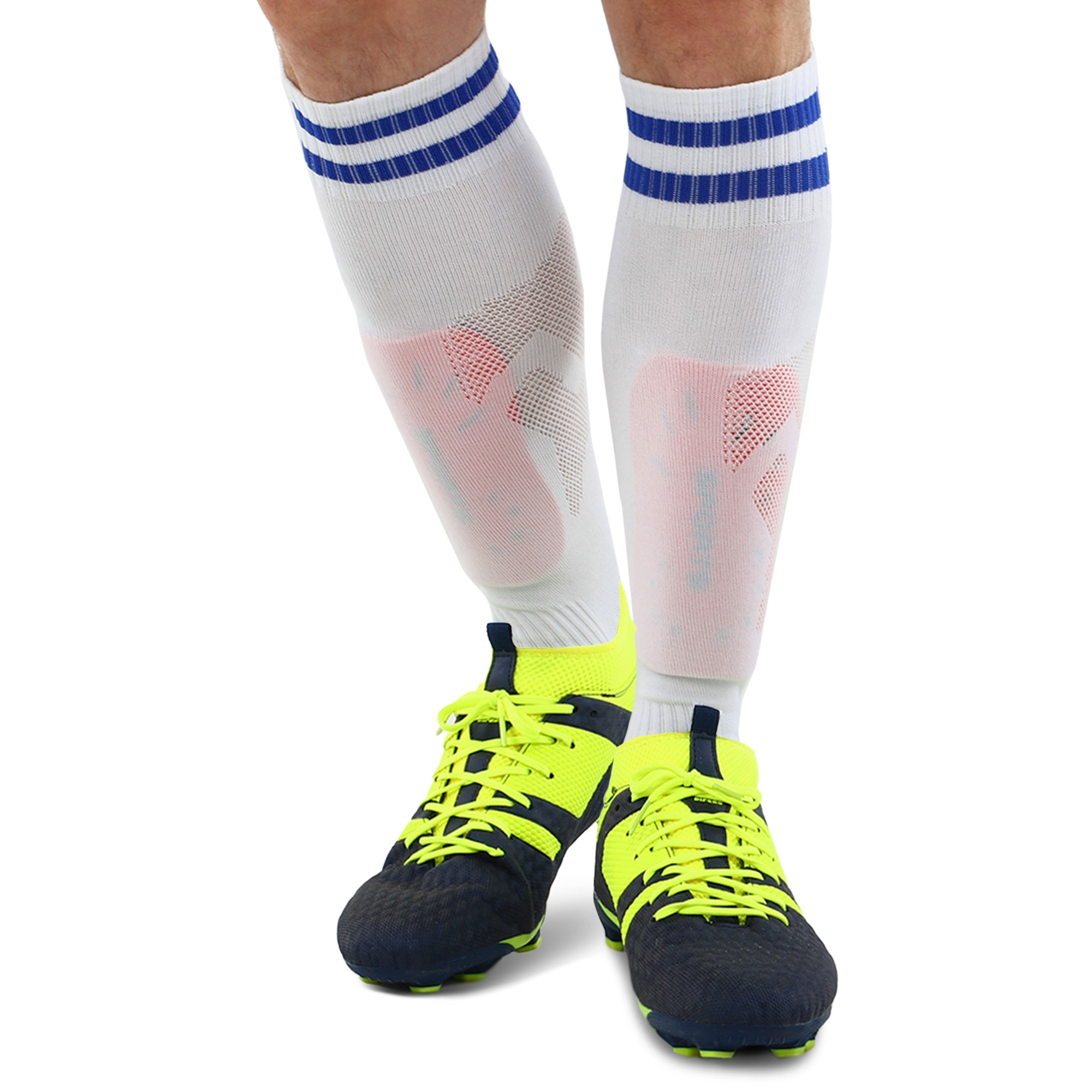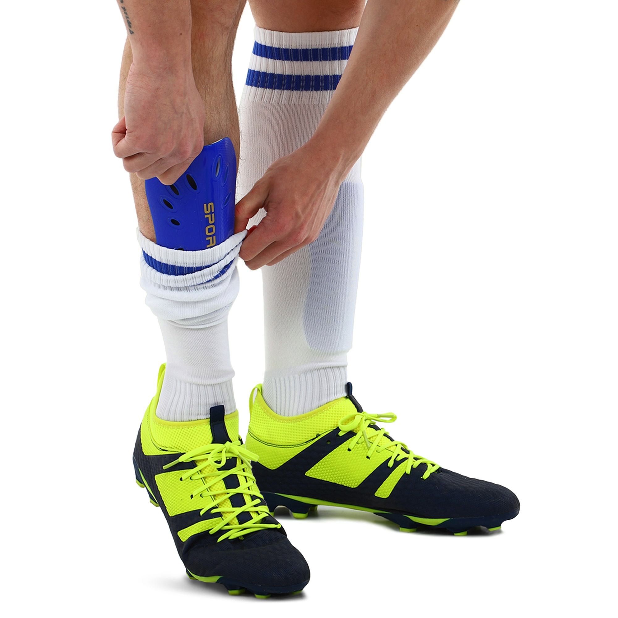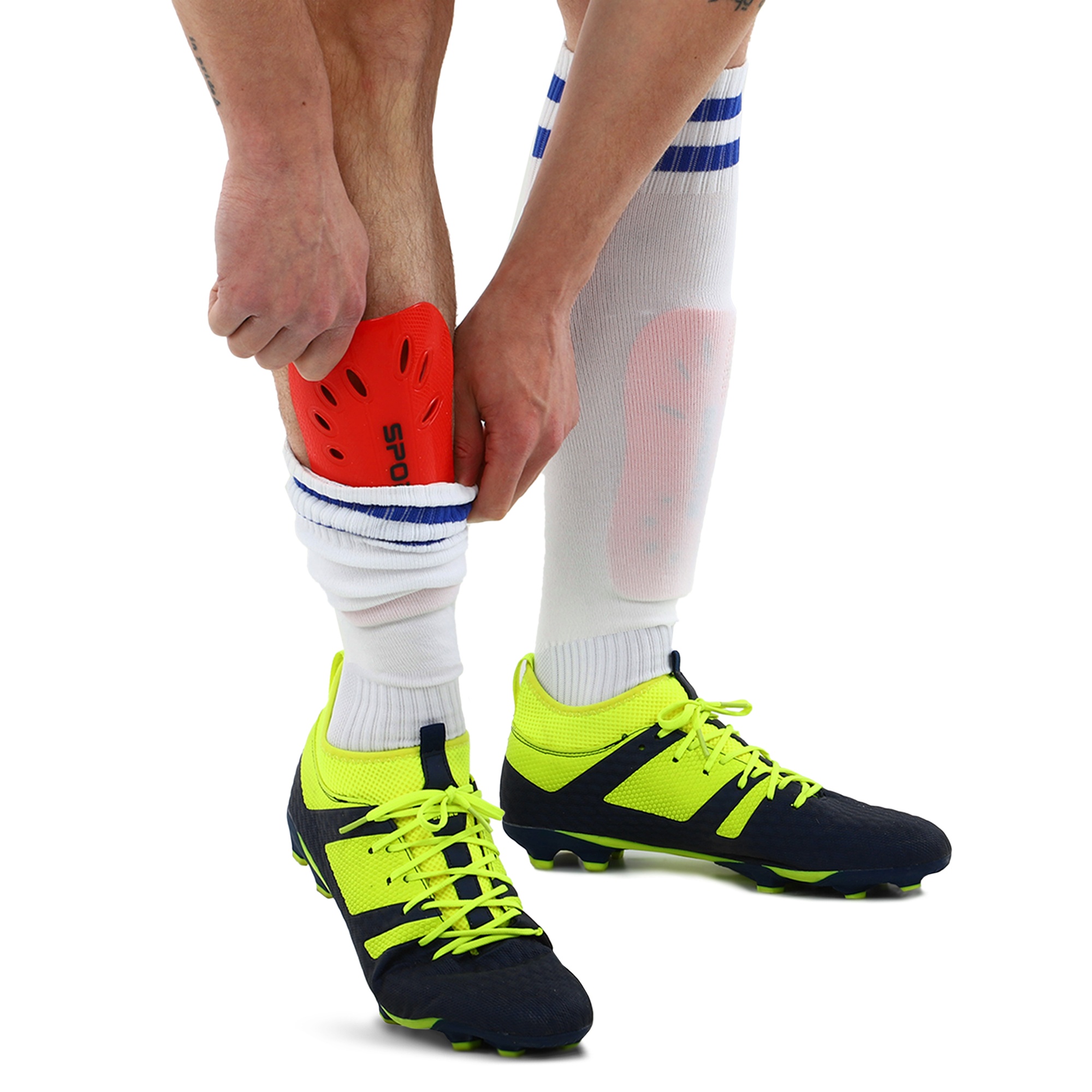 Щитки футбольные представляют собой жесткие накладки на переднюю часть ноги и предназначены для защиты голени игрока. Эргономичная конструкция обеспечивает высокий уровень защиты и комфорт спортсмена, щитки не мешают выполнять точные передачи и контролировать мяч при беге. Наружная поверхность щитков изготовлена из пластика с высокой прочностью, подкладка — из EVA. Оба материала очень легкие и не создают дополнительной нагрузки на ноги. Во время приема мяча, летящего на большой скорости, наружная поверхность щитков принимает на себя всю нагрузку, а мягкий внутренний слой поглощает ударную энергию. Дизайн щитков выполнен в современном стиле и позволяет комбинировать экипировку с формой разного цвета. Назначение Использовать футбольные щитки необходимо всем игрокам во время тренировок и игр в футбол. Это базовый элемент защиты, без которого возможность травмироваться значительно выше. Легкие и удобные щитки подойдут игрокам разного пола, возраста и уровня подготовки, а их цвет позволит игроку подчеркнуть свою индивидуальность. Преимущества футбольных щитков: