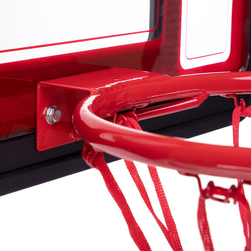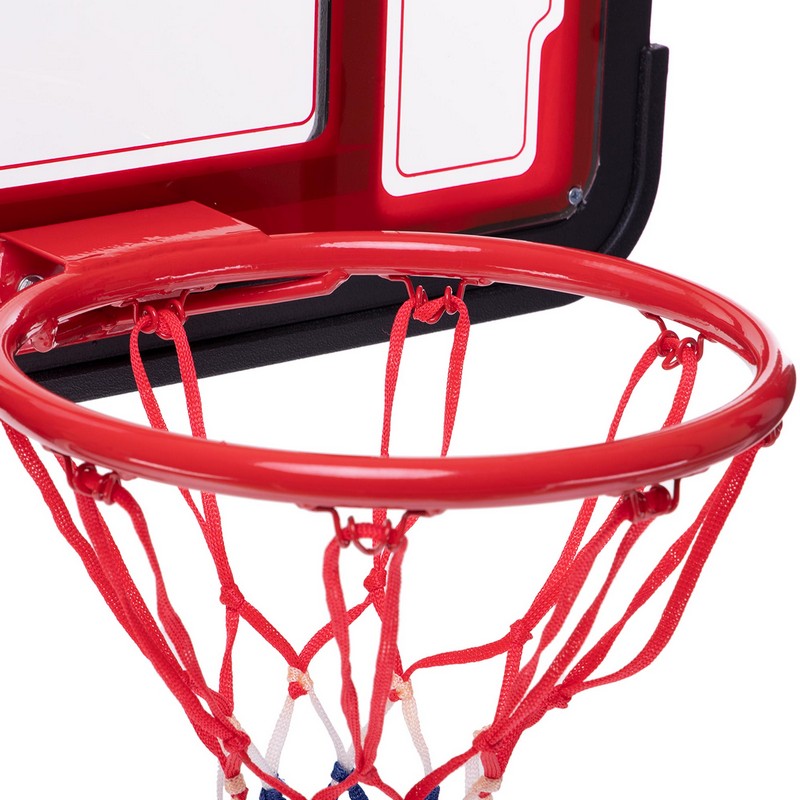 Баскетбольный щит имеет специальное крепление на дверь, которое позволяет надёжно зафиксировать конструкцию без применения каких-либо инструментов. Щит имеет уменьшенный размер по сравнению с профессиональными моделями — 60×40 см. Диаметр кольца, которое идёт в комплекте, составляет 25 см. Соответственно, с таким щитом необходимо использовать уменьшенный мяч, который также входит в комплект поставки. На кольце предустановлена сетка, выполненная из нейлона. Несмотря на уменьшенные размеры, щит имеет необходимую разметку. Он выполнен из прочного и качественного пластика.