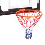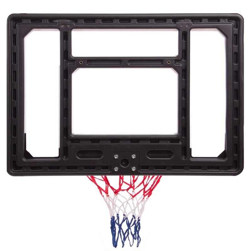 Баскетбольный щит изготовлен из пластика и имеет высокую прочность и устойчивость к воздействию влаги. Это позволяет использовать его в любых помещениях и даже на улице. Баскетбольный щит укомплектован кольцом диаметром 38 см. Кольцо крепится к щиту с помощью четырёх точек крепления, винты входят в комплект поставки. Кольцо выполнено из трубы диаметром 16 мм, что гарантирует высокую прочность конструкции. Также оно укомплектовано нейлоновой сеткой. Для фиксации сетки на кольце предусмотрено 12 точек крепления.