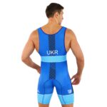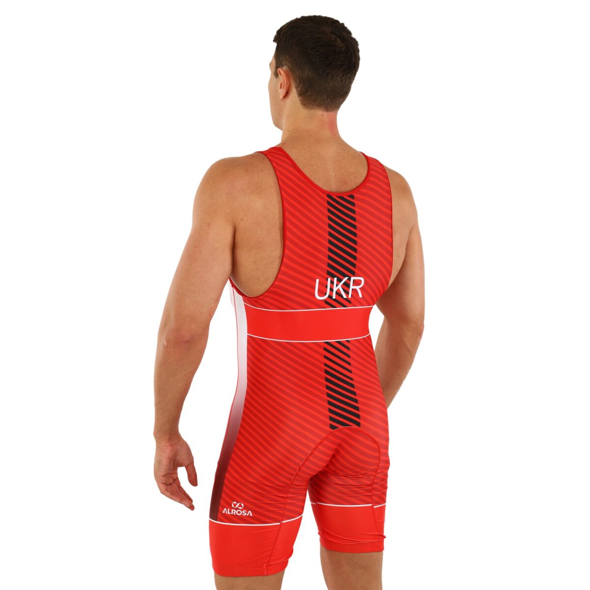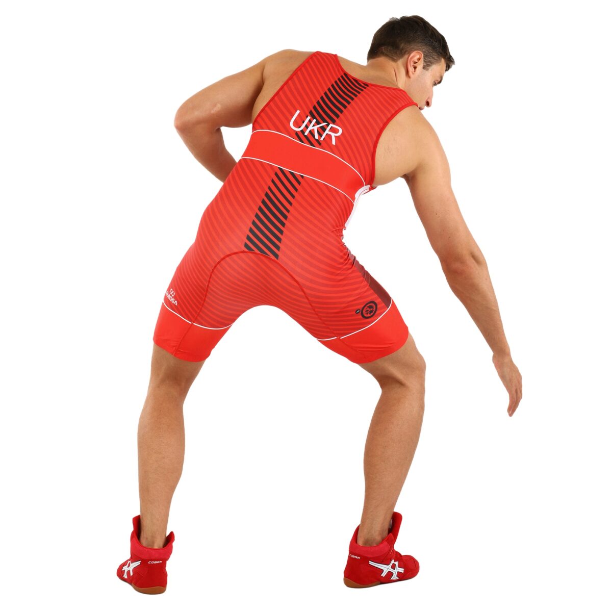 Трико предназначено для тренировок и соревнований по борьбе. Экипировка изготовлена в цветах, которые удовлетворяют правила соревнований, поэтому её можно использовать для участия в различных турнирах. Национальная символика расположена на груди, а надпись «UKR» на спине. Трико предназначено для взрослых и представлено больший размерным рядом.